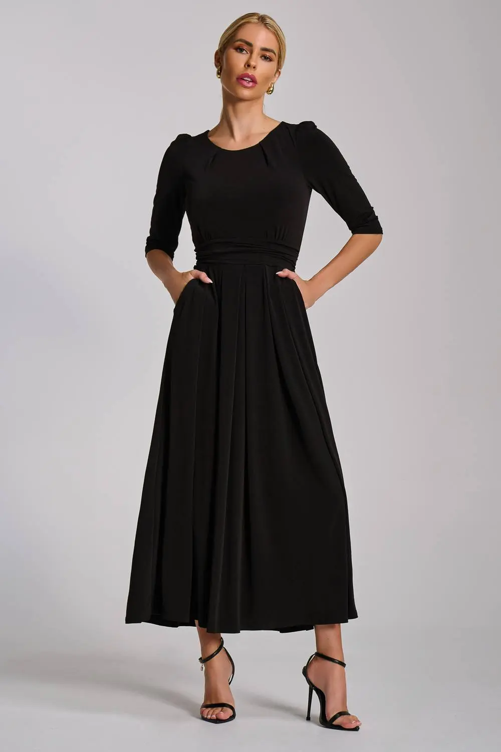 The three quarter sleeve jersey maxi dress by Jolie Moi features a round neckline with delicate pleats, a ruched waistband with two pockets, and a flowing pleated skirt. The 3/4 length sleeves are slightly gathered, and finished with a tie at the waist. Models height-170cm, and wears size 8, length 130cm. | Jolie Moi Women's Three quarter sleeve jersey maxi dress in Black | Size: 8
