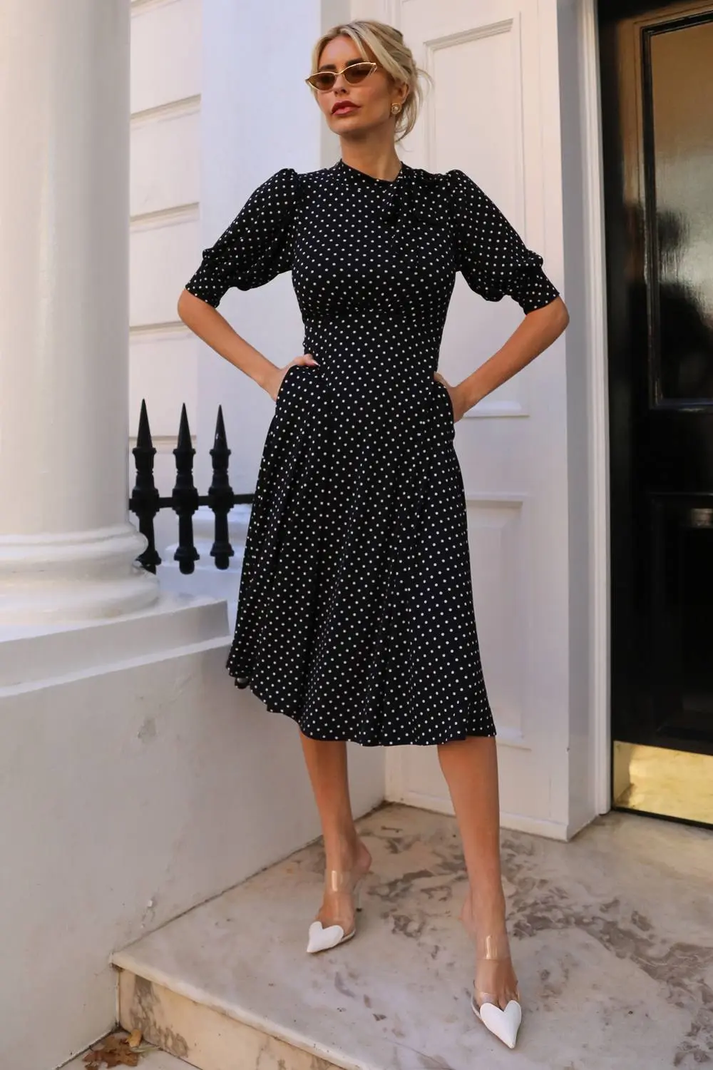 Jolie Moi Women's Tie Neck Puffy Sleeve Jersey Midi Dress in Navy