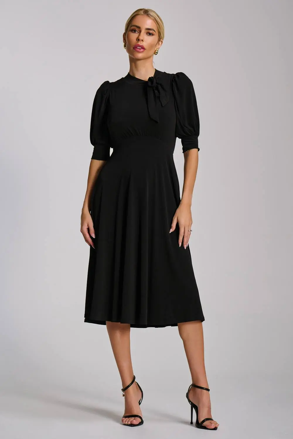 The Tie Jersey Midi Dress from Jolie Moi. Made from soft jersey, this midi dress offers short cuffed sleeves, a high neckline with a front tie detail, and a ruched waist secured by a tie fastening. Fully lined for comfort, the dress features discreet pockets and a pleated skirt. An elegant choice for any special occasion. | Jolie Moi Women's Tie Neck Puffy Sleeve Jersey Midi Dress in Black | Size: 8