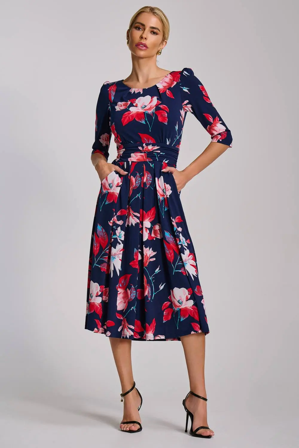 Sleeve Printed Jersey Midi Dress by Jolie Moi features a round neckline with delicate pleats, a ruched waistband with two pockets, and a flowing pleated skirt. The 3/4 length sleeves are slightly gathered, and finished with a tie at the waist. Models height-170cm, and wears size 8, length 116cm. | Jolie Moi Women's Sleeve Printed Jersey Midi Dress in Navy | Size: 16
