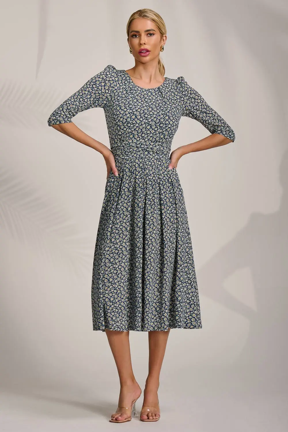 Sleeve Printed Jersey Midi Dress by Jolie Moi features a round neckline with delicate pleats, a ruched waistband with two pockets, and a flowing pleated skirt. The 3/4 length sleeves are slightly gathered, and finished with a tie at the waist. Models height-170cm, and wears size 8, length 116cm. | Jolie Moi Women's Sleeve Printed Jersey Midi Dress in Dark Navy | Size: 8