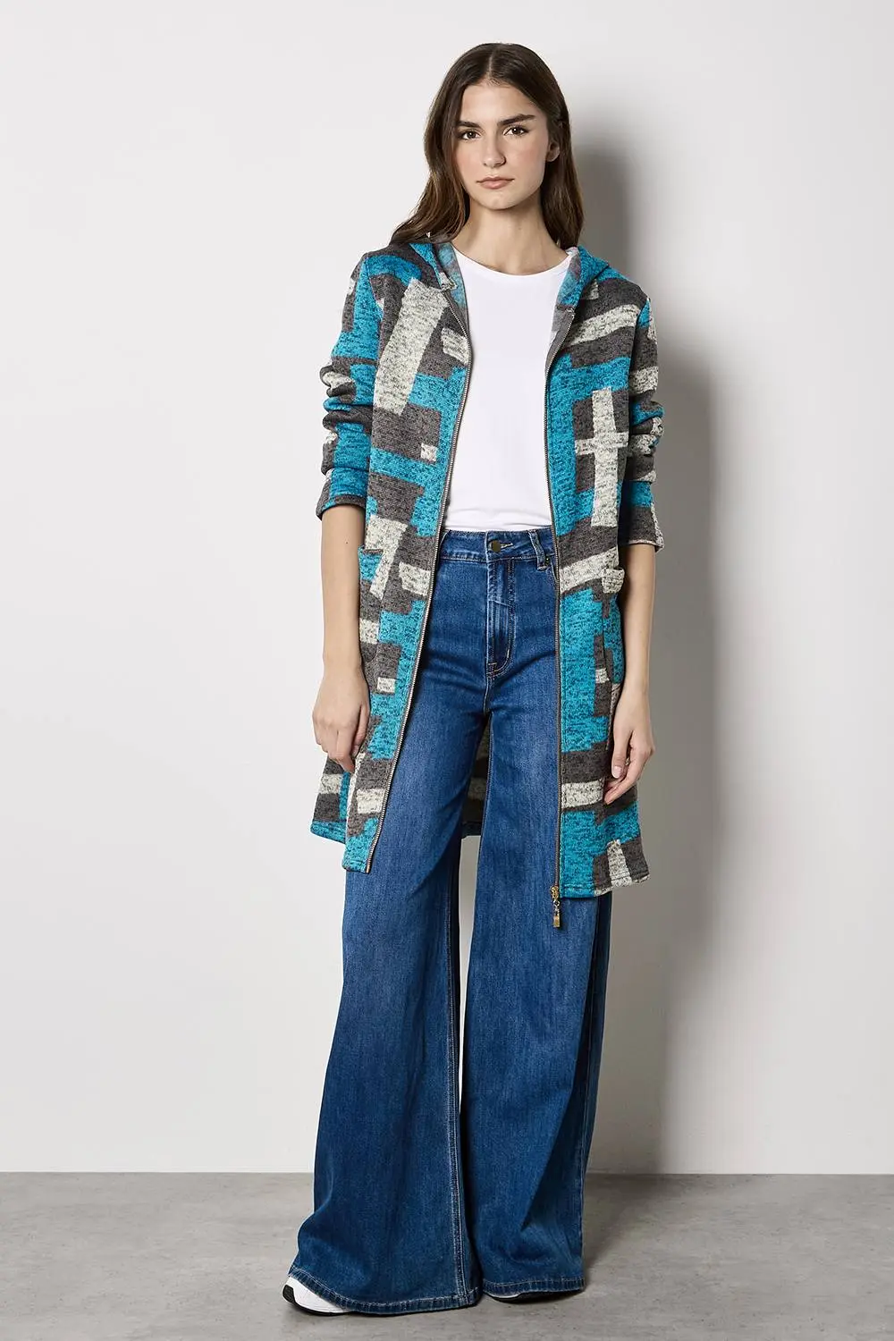 This longline cardi pairs a lightweight knit with a geometric pattern. Designed for chilly days, it features a hood, a zip-down front, and practical patch pockets. | Apricot Women's Geometric Knitted Zip-Down Cardigan in Dark Grey | Size: 12