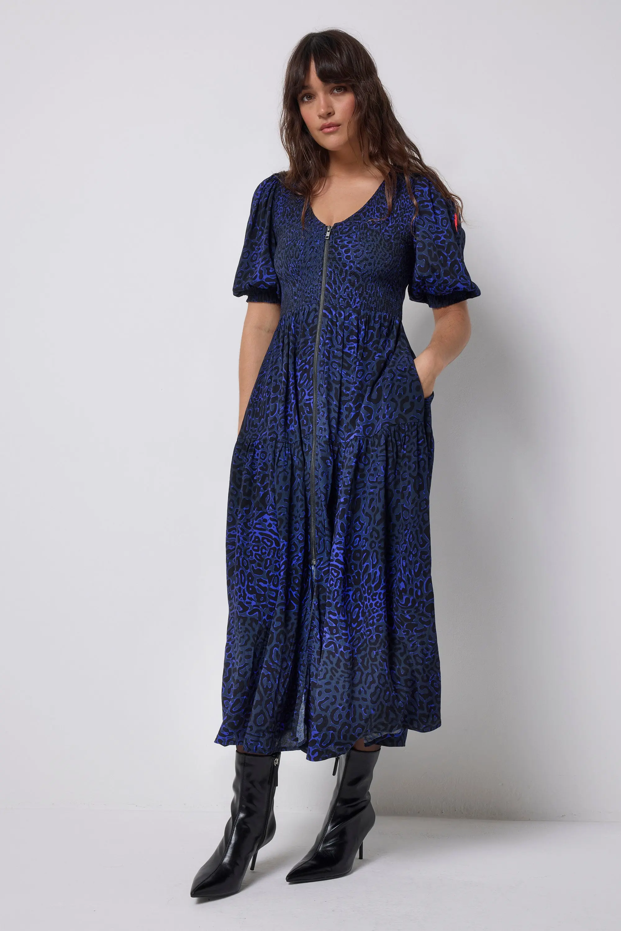 Navy Leopard Ray Shirred Zip Detail Midi Dress