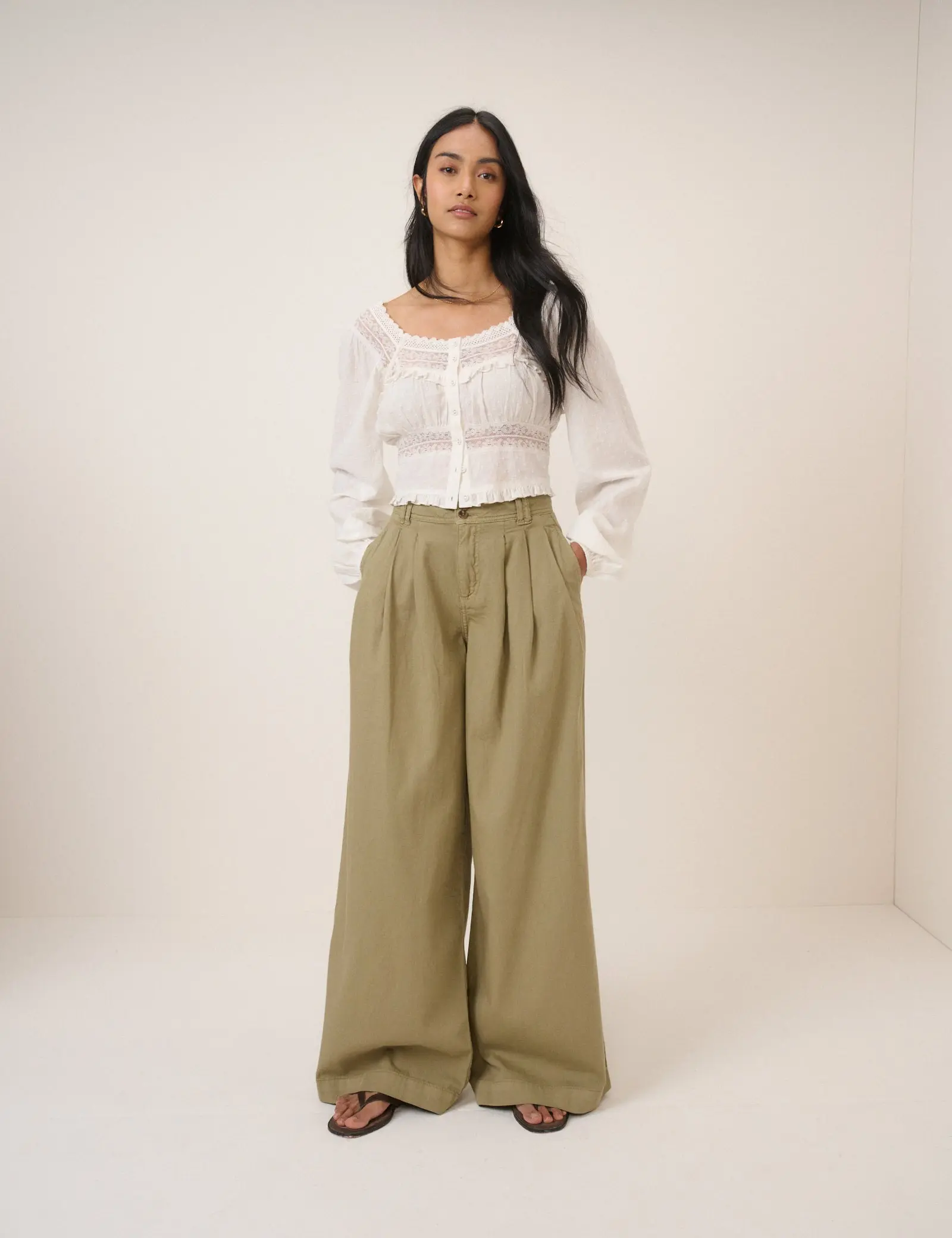 High waisted Wide leg Belt loops Pleats Side pockets Concealed zip fastening with mock horn button fastenings Short inside leg length: 73cm Regular inside leg length: 78cm Long inside leg length: 83cm Size tip: we recommend your usual size
