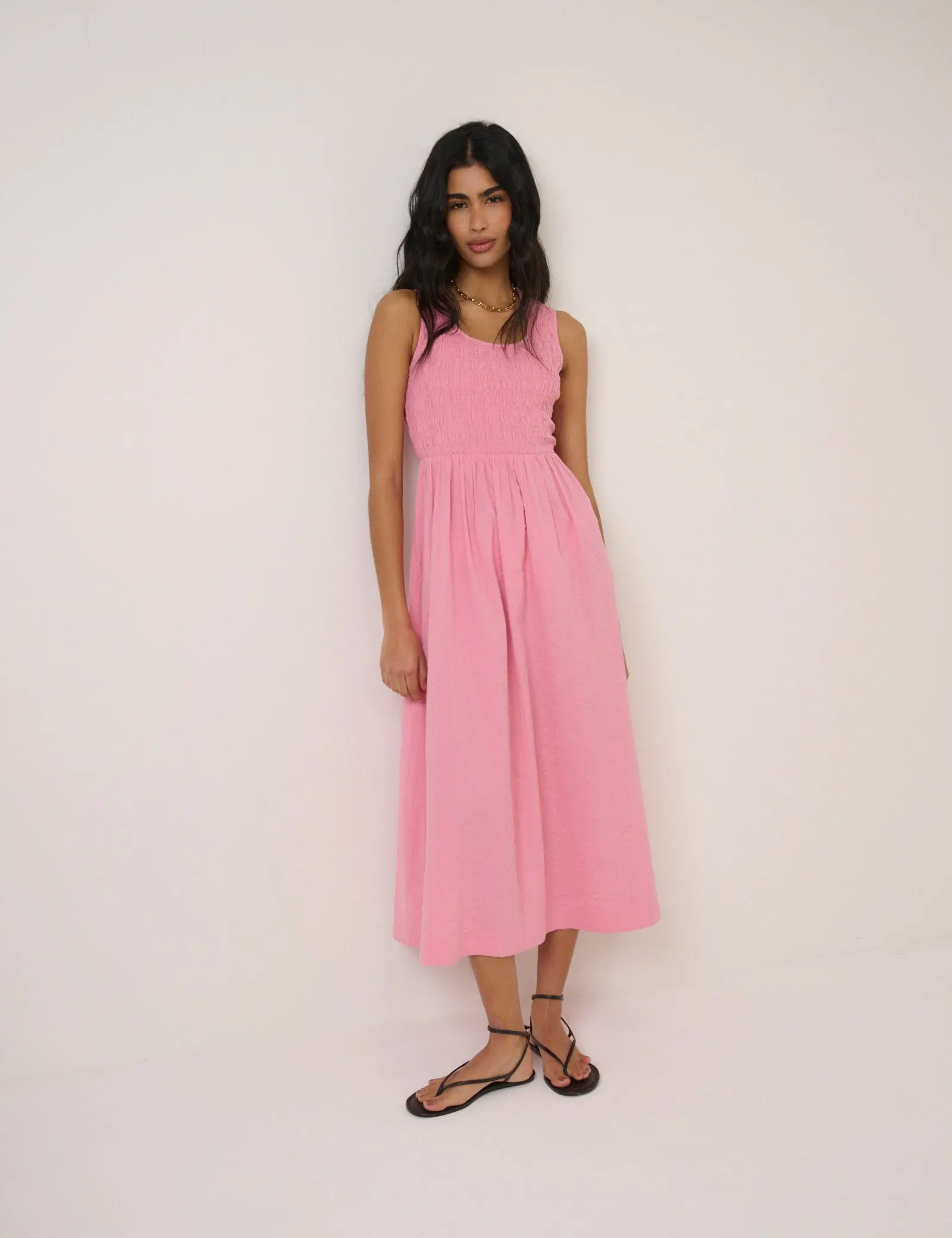 Scoop neck Sleeveless Shirred bodice for the perfect fit Elasticated waist Side pockets Relaxed skirt Size tip: we recommend your usual size