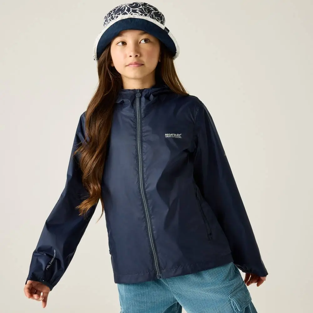 Stay ready for showers with the Lever kids jacket from Regatta. Lightweight Isolite 15000 fabric is waterproof and breathable with taped seams, and it packs into its own pocket. Ideal for school and outdoor play. Waterproof breathable ISOLITE 15000 lightweight 100% polyamide fabric - 80gsm Breathability rating 15,000 g/m/24 hours Durable water repellent finish Taped seams for complete waterproof protection Mesh lined Grown on mesh lined hood 2 zipped lower pockets Packaway - lower left side pocket converts into belt bag Printed name label (up to age 8) 360 Reflective trims | Regatta Lever Hooded Waterproof Jacket in Mid Navy | Size: 15-16 Years