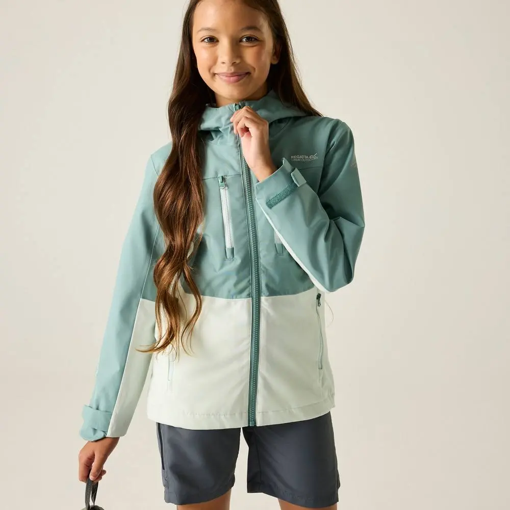 Stay protected in the Junior Highton kids jacket from Regatta. Waterproof and breathable Isotex 20000 stretch fabric with taped seams keeps rain out, while the technical hood adds weather coverage for school and hikes. Waterproof breathable ISOTEX 20000 100% polyester stretch fabric - 88gsm Breathability rating 20,000 g/m/24 hours 100% polyester mesh lining with 100% polyester taffeta lined sleeves Taped seams for complete waterproof protection Durable water repellent finish Grown on technical hood with high collar & elastication 2 zipped lower pockets & 2 zipped chest pockets Adjustable shockcord hem age 7+ Adjustable cuffs 360 Reflective trims Printed name label (up to age 8) Made with content | Regatta Highton Panelled Hooded Waterproof Jacket in Mint | Size: 6-7 Years
