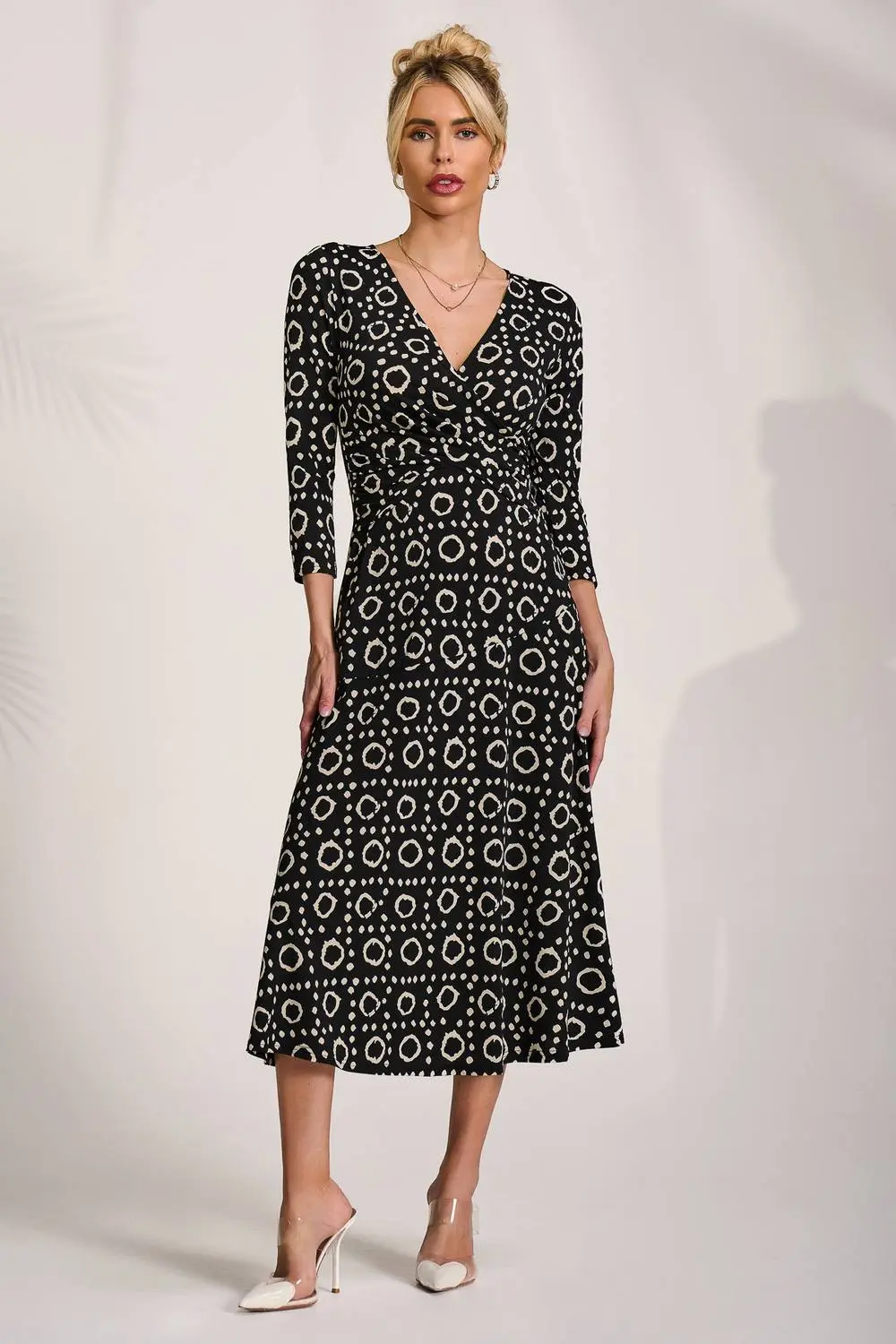 Jersey Midi Dress by Jolie Moi features a wrap front with a V-neckline and 3/4-length sleeves, with ruched waist detailing that flatters the figure, flowing into a fit-and-flare skirt with two pockets for added convenience.