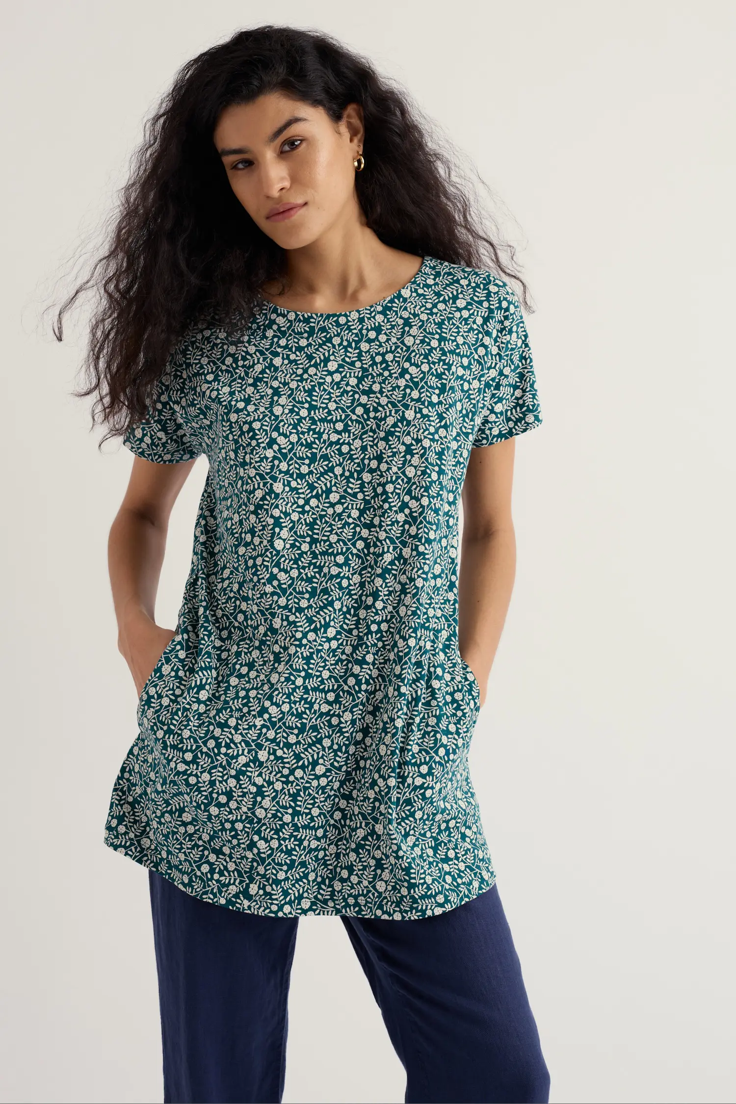 Summery, organic cotton jersey tunic with handy pockets. Choose from a floral print or nautical plain.
