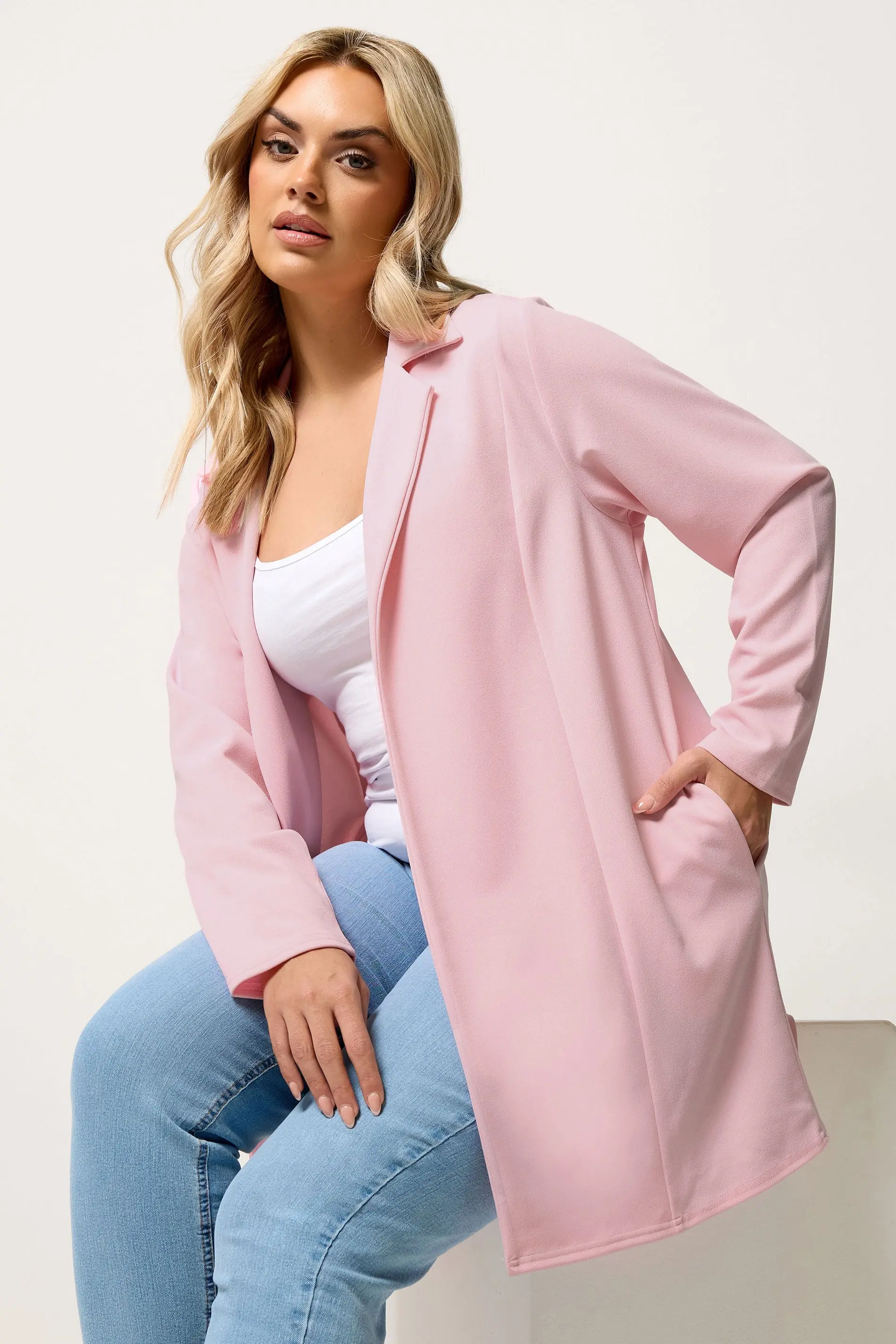 Product Description: This Yours Curve Pink Scuba Blazer is designed for women and curves, offering a flattering fit for every body. This stylish blazer features long sleeves and two functional pockets for a polished, tailored look. This is perfect for workwear, smart-casual occasions, or elevated everyday outfits. Made from a comfortable jersey fabric, this pairs effortlessly with trousers or skirts for a refined, coordinated look.