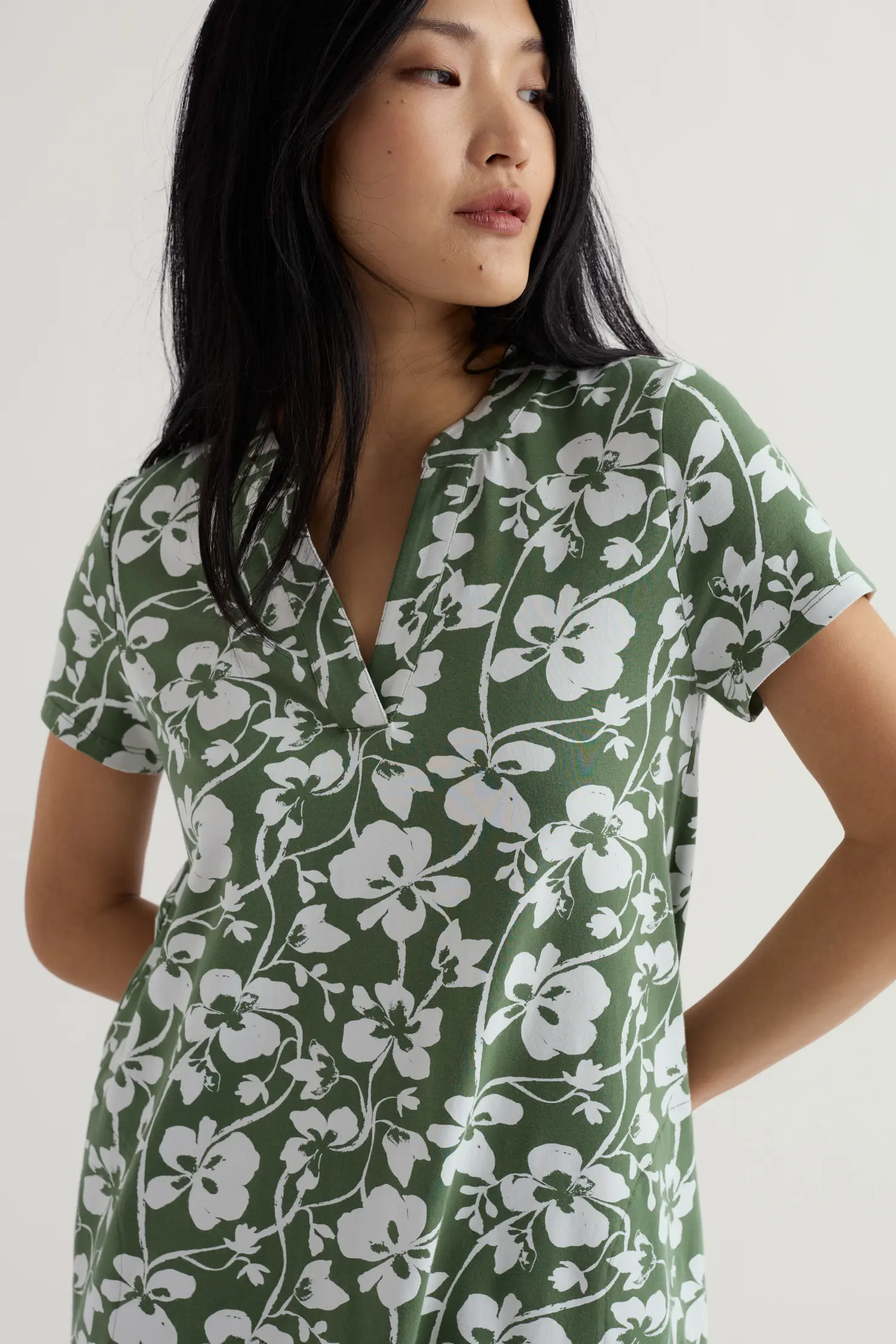 A short-sleeve jersey tunic made from soft organic cotton with added stretch. Printed, with a notch neckline detail and in-seam side pockets.