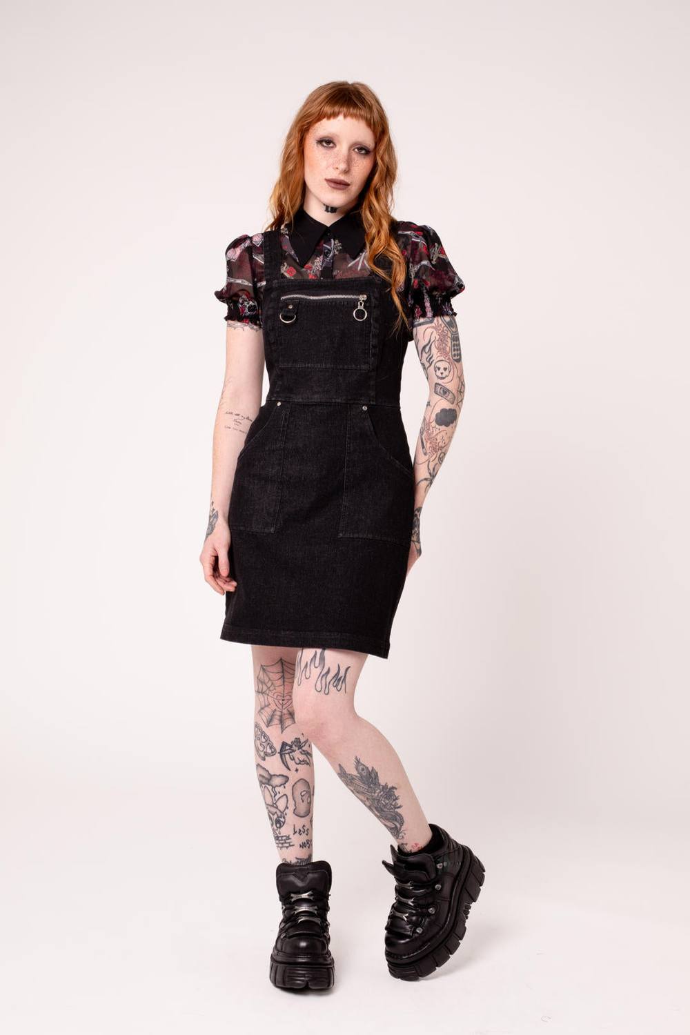 Hell Bunny Women's Raye Denim-Look Pinafore Dress D-Ring Pockets & Adjustable Straps in Black
