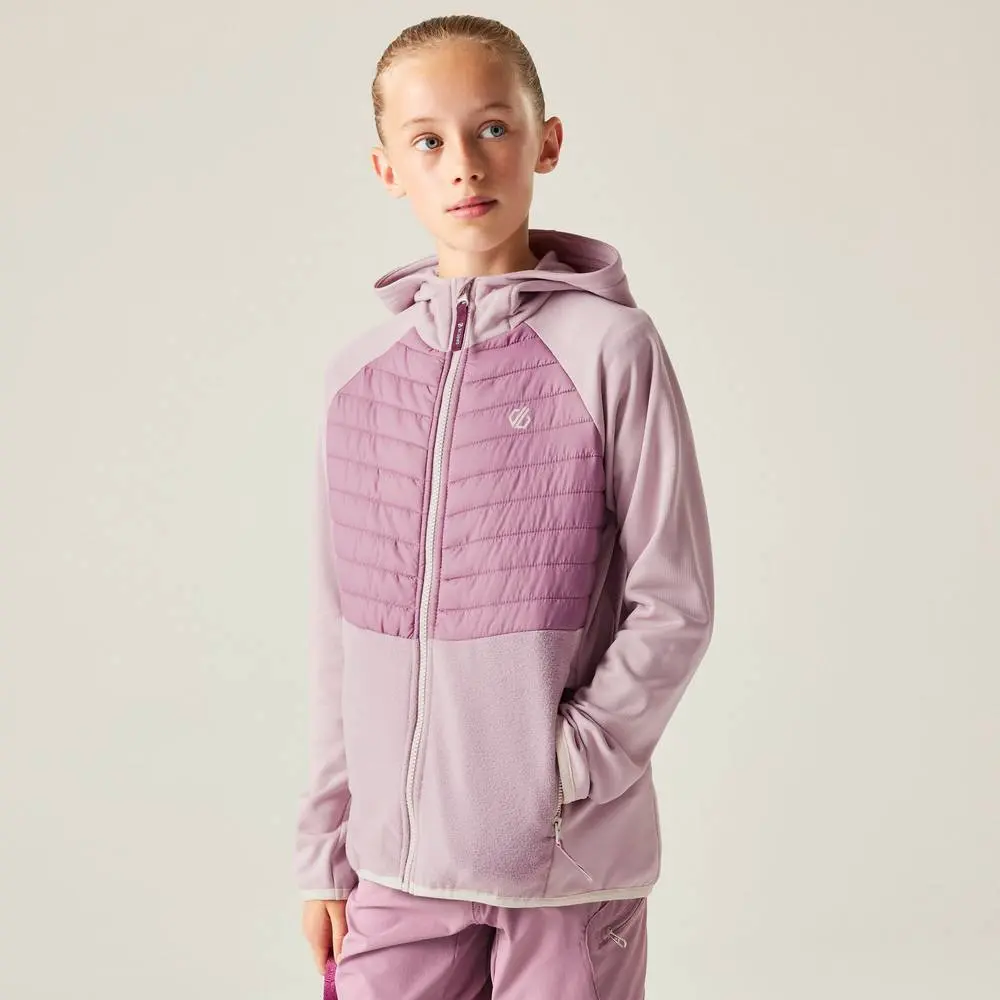 The Switch Out Hybrid. Designed for young adventurers, this jacket features a hybrid design for optimal performance. The ILoft air padding provides maximum warmth with minimal bulk, staying fully compressible and lightweight. The centre front and back body panels are insulated with ILoft air padding and overlaid with showerproof woven ripstop fabric, while the sleeves, side panels and hood feature soft textured grid polyester fleece for added warmth and comfort. Stretch binding at the cuffs and hem ensures a snug fit. Perfect for those seeking high-performance outdoor gear. 95% polyester/5% elastane soft textured grid fleece to sleeves, side body panels & hood - 245 gsm polyester ILOFT AIR padding; minimal bulk insulation that's fully compressible & extremely lightweight at 100 gsm PFAS Compliant Grown on hood Full length zip with inner zip & chin guard 2 lower zipped pockets Stretch binding to cuffs & hem Reflective zip pullers for extra visibility | Dare 2b Switch Out Hooded Hybrid Jacket in Mauve | Size: 15-16 Years