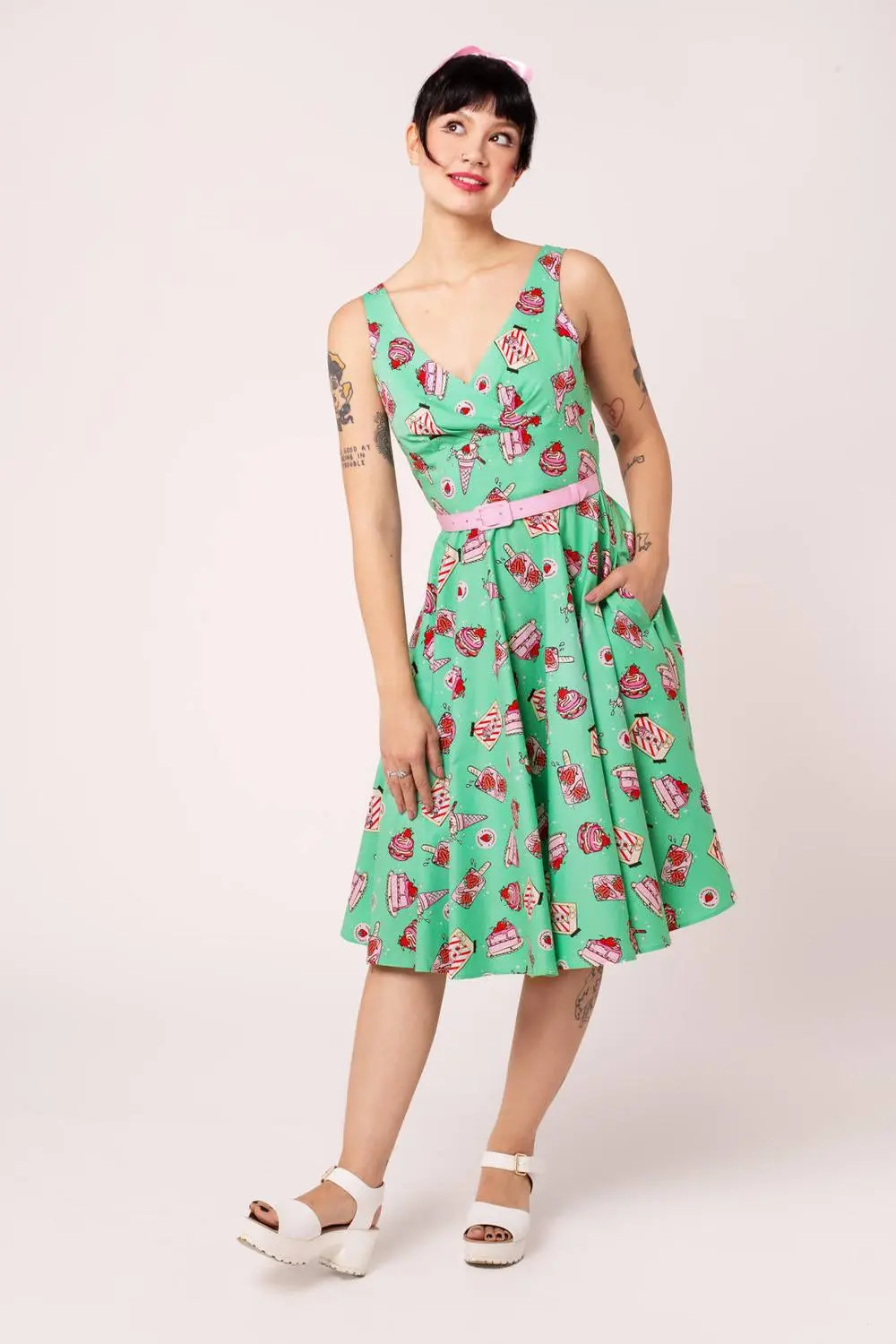 Nothing says sweet like The Sweetie Pie Dress. This 50s style, printed cotton dress features a soft green base, illustrated with fresh desserts and confectioneries. The fitted bodice is shaped with a decorative, wrapover bust panel, creating an elegant V-neckline that enhances the chest. A full circle skirt flows from the waistband, perfect for pairing with our petticoats. Discreet yet practical pockets in the side seams make this skirt both pretty and practical for wherever your day takes you. Style with The Lucie Cardigan in Pink to bring even more vibrancy to your outfit! Belt loops on the waist, pink belt included Zip fastening on the centre back Fabric content: 98% Cotton 2% Elastane Fit advice: Fabric has stretch, stick to sizing advised on the size guide for bust & waist, hip measurement is not needed as the skirt is flared Length: Skirt is 65cm from the waist seam to the hem in size small, the length slightly increases with each size. | Hell Bunny Women's Sweetie Pie 50s Green Dessert Print Cotton Dress Full Circle Skirt | Size: Medium