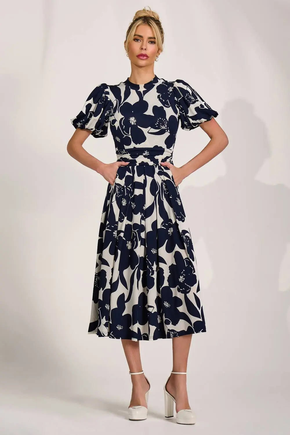 The Turtle Neck Puff Sleeve Jersey Midi Dress by Jolie Moi features a high neckline and short puffed sleeves finished with a self cuff, a slightly gathered waistband, creating a soft drape that flows into a pleated skirt with two pockets. This dress is a stylish choice for any occasion. Models height:170cm, and wears size 8. | Jolie Moi Women's Turtle Neck Puff Sleeve Jersey Midi Dress in Cream | Size: 8