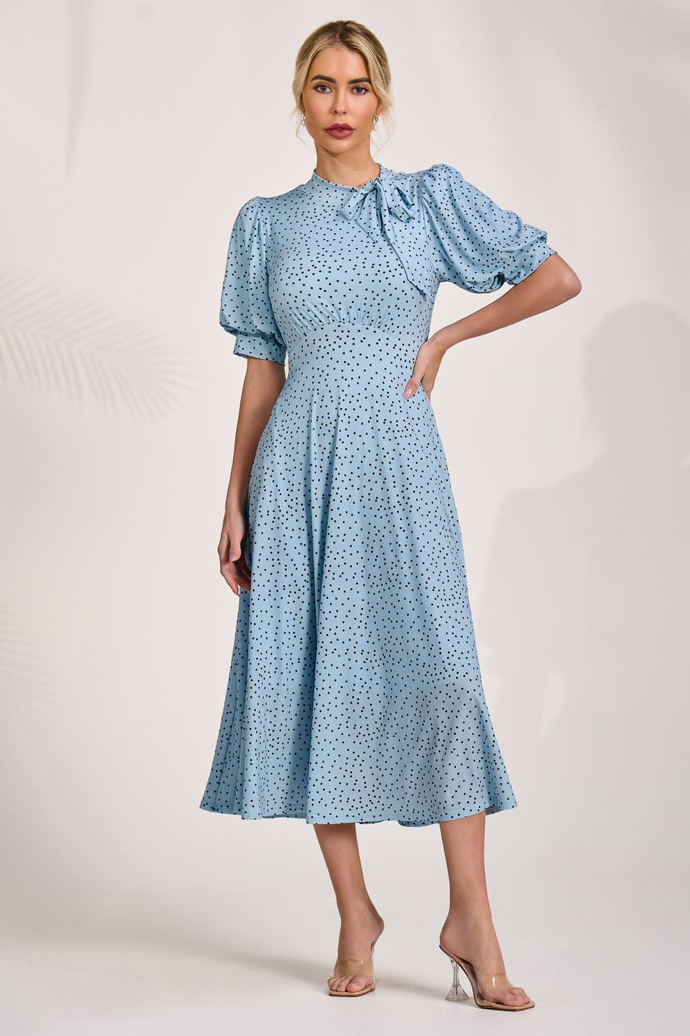 Jolie Moi Women's Tie Neck Puffy Sleeve Jersey Midi Dress in Light Blue