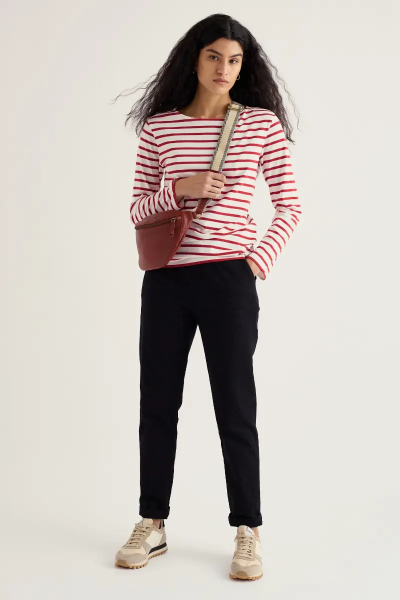 Tapered trousers with stylish nautical detailing. Our bestselling Waterdance Trousers are a year-round favourite, with a touch of stretch for ease of movement. They sit on the natural waist and have a relaxed tapered shape that's flattering and easy to wear - just roll them up to vary your look. They are styled with side fastening buttons and an elasticated back waistband for a comfortable fit and finished with two slanted side pockets and two back pockets.