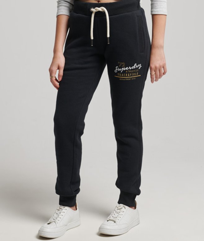Throw on our Track & Field joggers to effortlessly upkeep your contemporary, athletic aesthetic. Finished with pockets, a thick drawstring waist and a luxuriously soft fleece lining, whether you're training hard or just lounging about, this sporting essential has you covered- you'll enjoy the endless versatility of these essential joggers. Straight Fit. Classic for a reason - the original fit that gives you extra room throughout without being baggy or too loose fitting. About as authentic as you get. Mid-rise Drawstring, ribbed waist Fleece lined interior Two exterior front pockets One exterior back pocket Ribbed cuffs Superdry logo print and patch