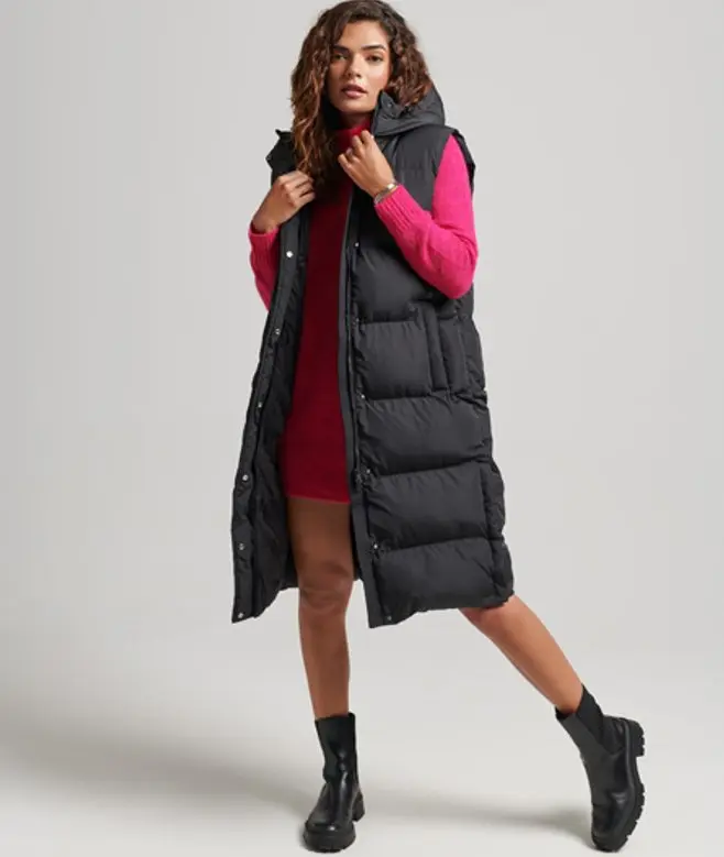 The perfect addition to your wardrobe this season - the Longline Hooded Padded gilet. For extra body warmth and elevating the outfit, this winter warmer will be your go-to. Throw over a hoodie or your casual outfit to compliment your personal style. Oversized fit - exaggerated and super relaxed, let your style flow Padded design Bungee cord adjusted hood Zip and popper fastening Popper fastening side seams Two front pockets Signature logo metal tab The padding in this jacket is made using up to 100% recycled materials. Each jacket contains between 5 and 48 recycled bottles, depending on the weight and amount of fill used, saving waste being sent to landfill or polluting our oceans.