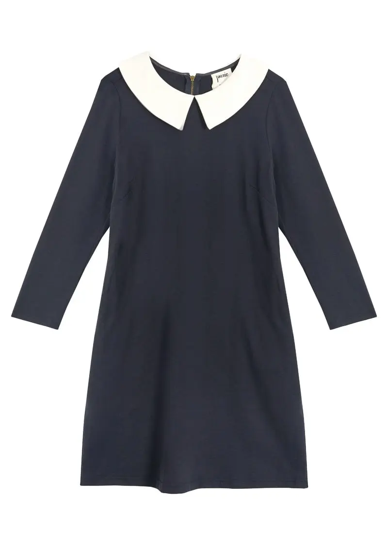 Suzy makes nailing ‘60s style easier than ever before! This mod-style mini day dress is crafted from an incredibly soft and stretchy organic cotton jersey fabric in a deep navy hue and features an oversized contrast collar, an exposed metal back zip with a retro ring pull, three-quarter length sleeves, and in-seam pockets. Feeling comfy and looking cool has never been easier, thanks to Suzy!Abigail is 5'11 and is wearing a size 10Regular fit - take your usual sizeSize 10 dress length: 87cmOversized collar Soft and stretchy jersey fabricBack zipMini lengthPocketsFor specific measurements of this garment, please see the Size Guide.