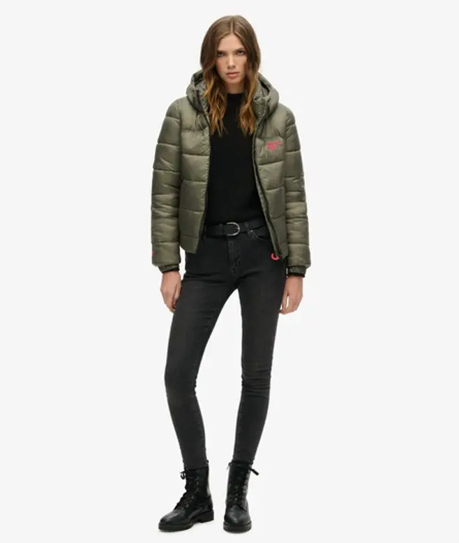 Superdry Women's Slim Fit Embroidered Logo Sports Puffer Bomber Jacket, Dark Green,