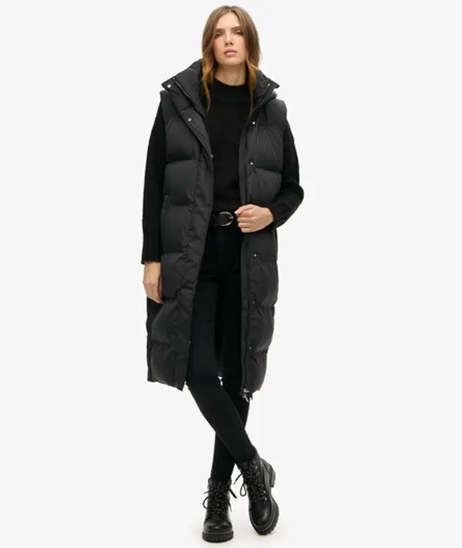 Superdry Women's Classic Logo Badge Long Hooded Puffer Gilet, Black,