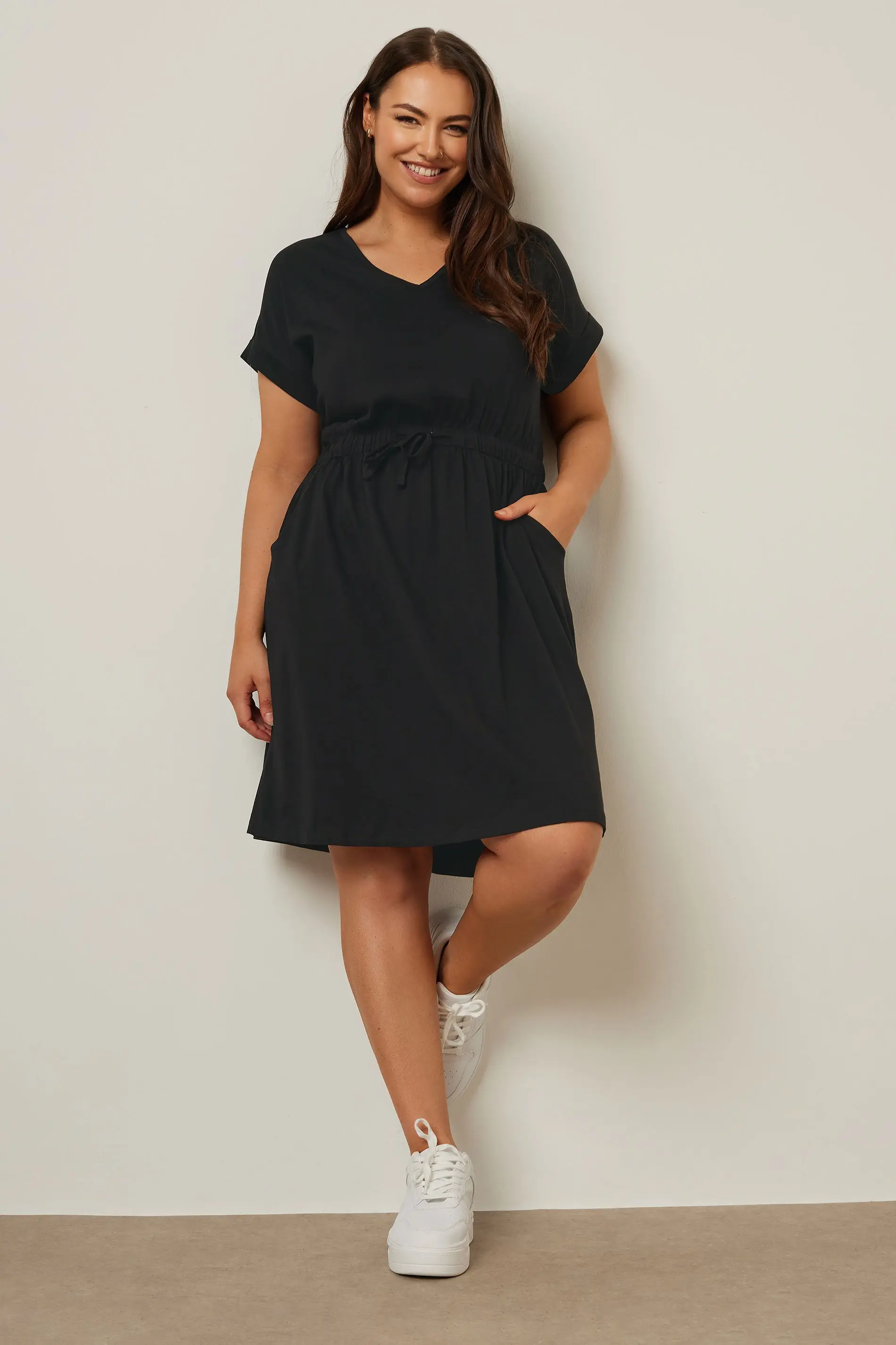 Elevate your casual collection with this plus size t-shirt dress. Made from a stretchy jersey fabric, it features two side pockets, a v-neckline and an elasticated waistband with a drawstring tie. Pair with sandals and a shoulder bag for a stylish off-duty outfit.