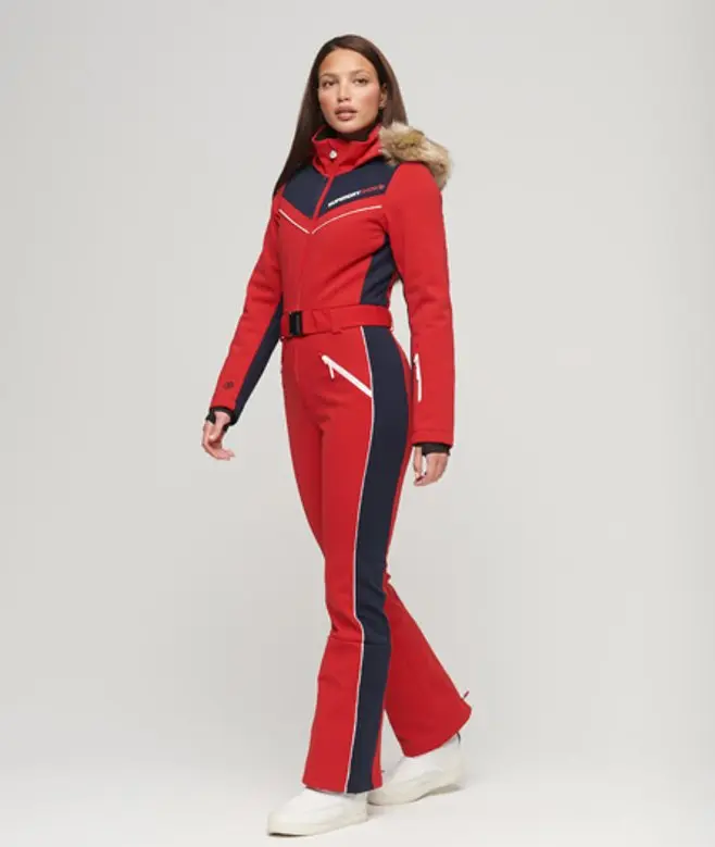 You're going to look the part on the slopes this ski season. Distinctly retro in its appearance, this Ski suit brings with it contemporary features that will make your time on the runs so much more pleasurable and stylish. From the hood with its faux fur trim right down to the boot gaiters, everything about the ski suit has been done with comfort and practicality at the fore. Slim: Fits close to your body, enabling you to show off that perfect form Breathable 10k/MM - Provides airflow comfort for low to mid-level activity Waterproof 10k/MM - Rainproof and waterproof under light pressure, for light rainy days Durable water repellency - This fabric has been coated with an advanced water-resistant finish Bonded softshell fabric LIned and padded upper Detachable faux fur trim Soft-lined inner collar Zip fastening with snap buckle belt Two zipped pockets Ski pass pocket Inner sleeve cuffs with thumbholes Zipped and gusseted ankles Boot gaiters with silicone gripper bands Zipped inner pocket Embroidered and printed Superdry logos