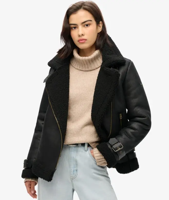 Channel that retro look of the glamour days in early aviation. An absolute must for early pilots and an essential addition to your wardrobe. The Aviator jacket is a timeless piece that has a spirit of adventure in its heritage. Bring your own spirit into the mix by pairing this sumptuously soft faux sheepskin jacket with your favourite outfit and create a unique look. Let the Faux Shearling Aviator jacket be your wingman and it'll be the perfect wardrobe partner. Relaxed fit - the classic Superdry fit. Not too slim, not too loose, just right. Go for your normal size Faux sheepskin fabric with suede effect finish Asymmetric zip fastening Buckle neck strap Two zipped pockets Waist buckle adjuster straps Cuff buckle adjuster straps Full faux shearling lining Antique finish hardware Leather zip puller Subtle metal logo badge