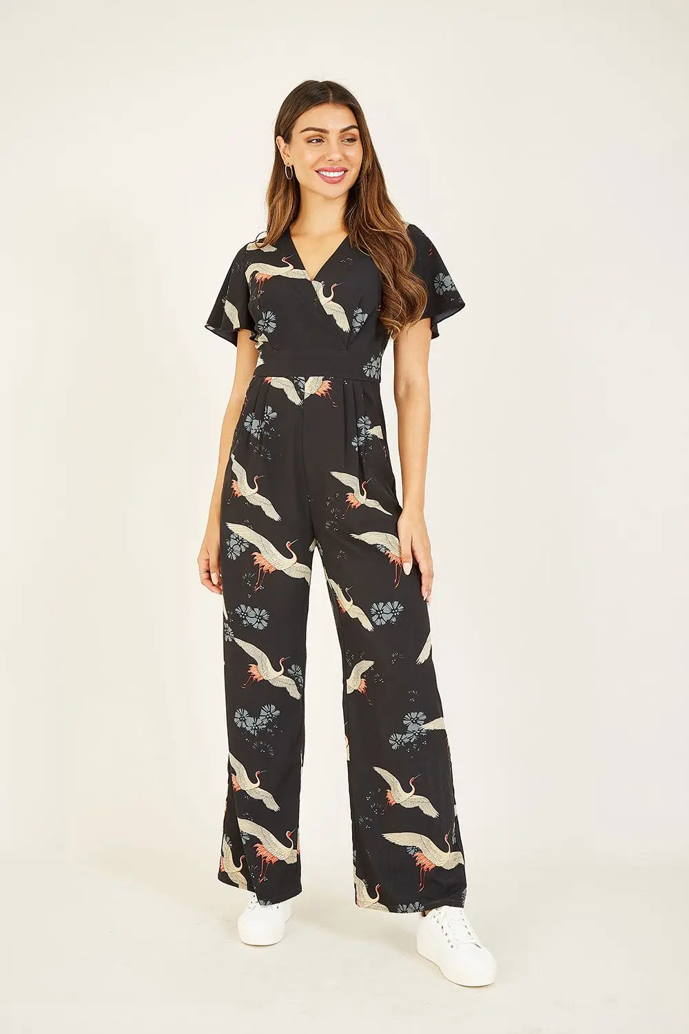 Lightweight and flowing, this jumpsuit from Yumi lends a formal feel to your wardrobe. Featuring a stylish crane print, it's designed with angel sleeves and a fitted waist with a tie for a refined touch. It's complete with a zip fastening on the back.