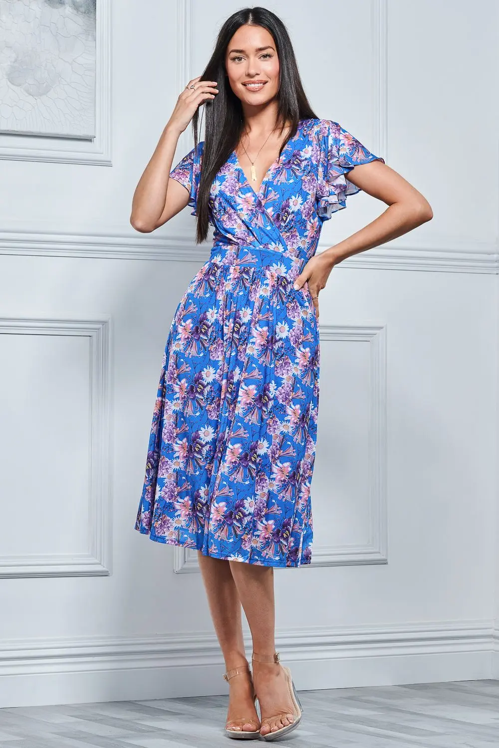 Flaring out at the hem for a feminine silhouette, this midi dress by Jolie Moi is printed with pretty florals for added charm. With a wrap-over front and short angel sleeves, it is sure to keep you in focus at your next summer occasion.