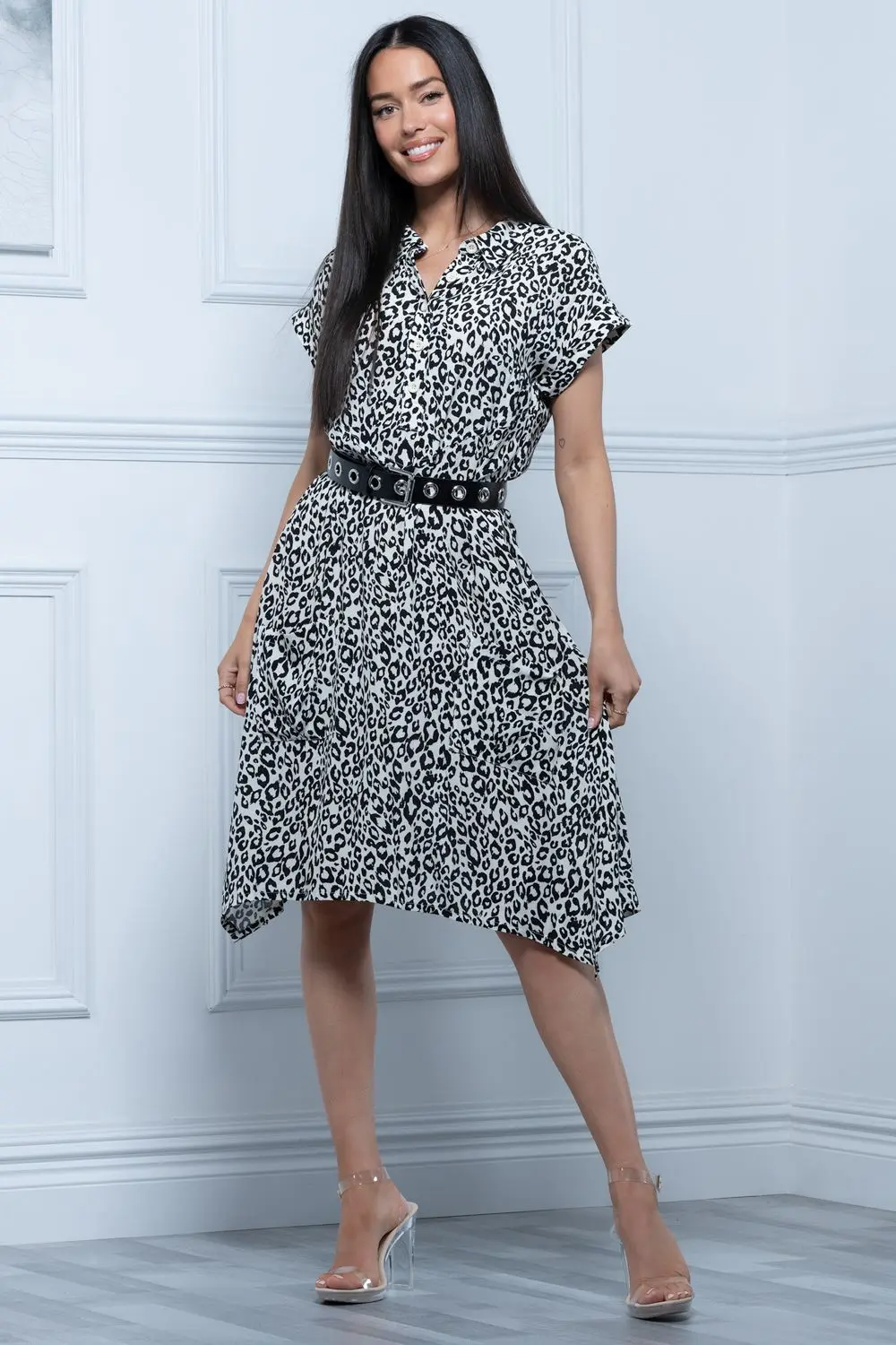 Dress it up, or dress it down. The Elle hanky dress gives you the option. Crafted from 100% Polyester and complimented by an on-trend animal print pattern. The dress is finished with front buttons, short sleeves, collared neckline and two side pockets. Complete the look by styling with a belt.