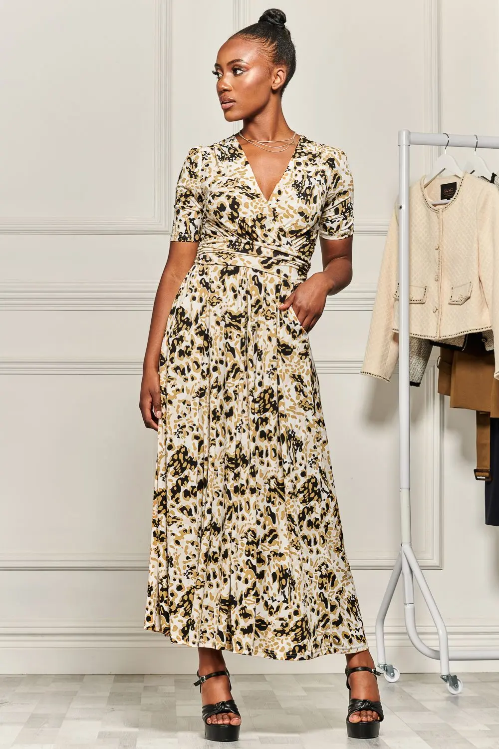Add contrast to your wardrobe with this versatile bold pattern print dress from Jolie Moi, crafted from our stretchy non-static, crease proof material for all day comfort. Designed with a front wrap v-neck and short sleeves that flows into a subtle pleated maxi hem. Perfect for adding some pattern to your day or night occasions.