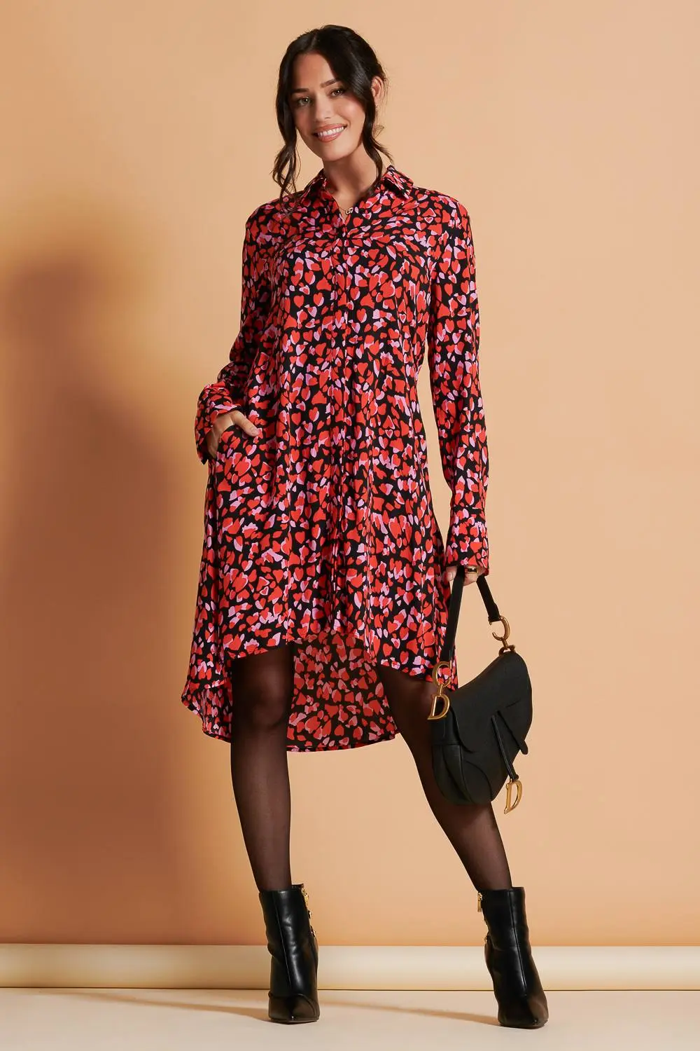 This oversized shirt dress from Jolie is all you for all your stylish outings. Complimented by a collared neckline, long buttoned sleeves, and a gorgeous abstract heart print. Style it with a pair of leggings and boots to complete the look.