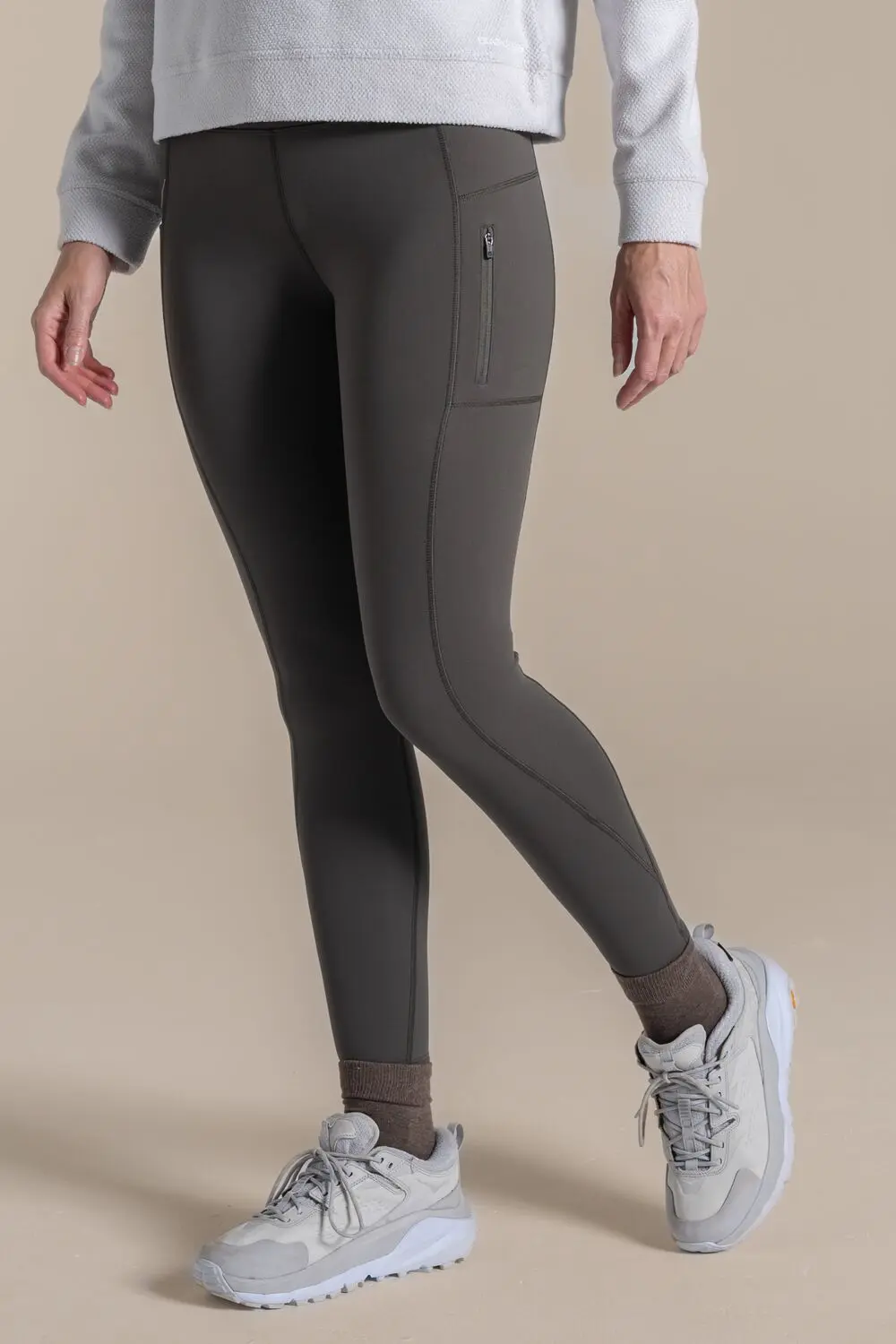 Thermal trekking tights from Craghoppers. Stride out on the winter trail in these brilliant 'Kiwi Pro Thermo' leggings. The sun-protective stretch construction with snug brushed back helps trap body heat, while the EcoShield DWR finish repels showers. Perfect for active pursuits in cooler conditions.Zipped security pocketFull legging length2 pocketsUPF 40+ sun-protection245g