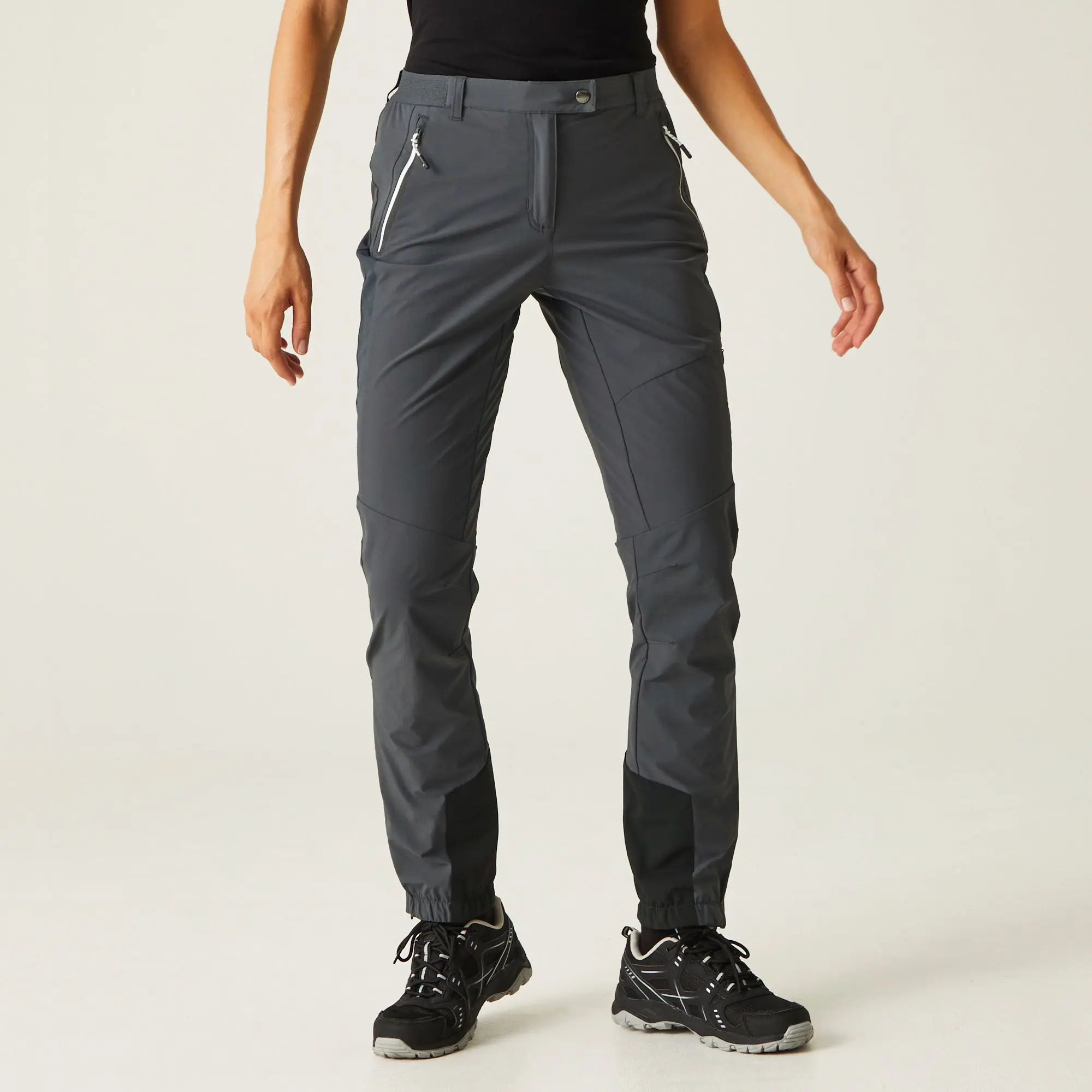 The women's Mountain III trousers from Regatta- Isoflex stretch delivering outstanding durability, mobility and weather protection. Built for action from quick-drying stretch-woven fabric with a DWR (Durable Water Repellent) finish and abrasion-resistant Cordura overlays at wear points. Engineered with a slim, ergonomic fit and articulation at the knee for outstanding mobility. The waistband is cut higher at the back for coverage during long reaches and features part-elastic for a comfortable fit that stretches with you.