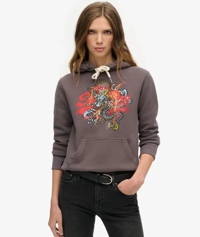 When you want to bring some sparkle into your life, look no further than our Tokyo Vintage Logo Graphic Hoodie. This essential staple is designed with a printed graphic and rhinestone detailing that tells its own story. Running errands or lounging around, this layering option is the perfect companion. Relaxed fit - the classic Superdry fit. Not too slim, not too loose, just right. Go for your normal size Drawcord hood Ribbed cuffs and hem Large front pocket Rhinestone embellished graphic Signature Superdry tab Eastern culture is represented in this print with a dragon motif.