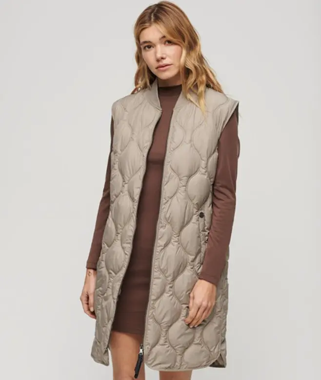 Superdry Ladies Quilted Studios Long Liner Gilet, Beige,