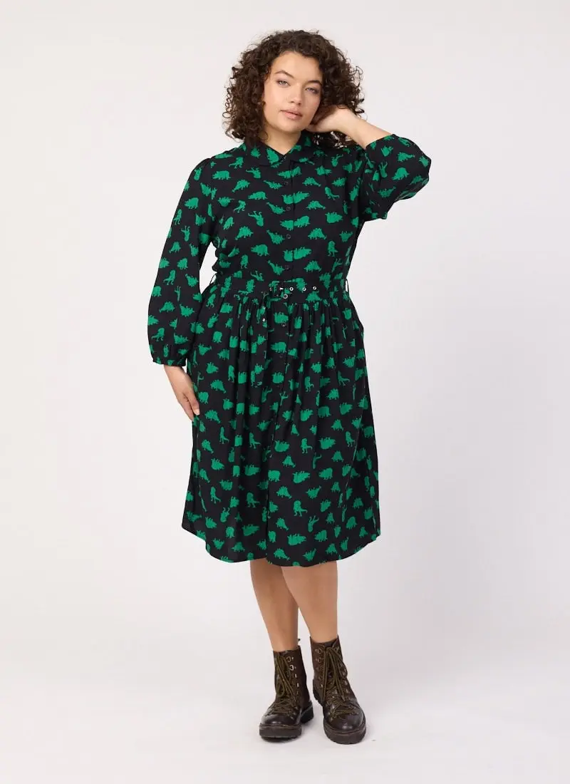 Don’t dino-snore on Andi’s new print… This classic shirt dress is crafted from our favourite super-soft sustainable fabric with LENZING™ ECOVERO™ viscose fibres in an all-over green dinosaur silhouette print on a black background and features three-quarter length sleeves and a half button-through placket on the bodice that leads to a gathered-on skirt with a matching removable belt. Laura is 5'11 and is wearing a UK size 10Charlotte is 5'7.5 and is wearing a UK size 16Regular fit - take your usual sizeUK Size 10 dress length: 102cmAll-over green dinosaur silhouette printClassic shirt dress shapeThree-quarter length sleevesButton-through frontPocketsFor specific measurements of this garment, please see the Size Guide.