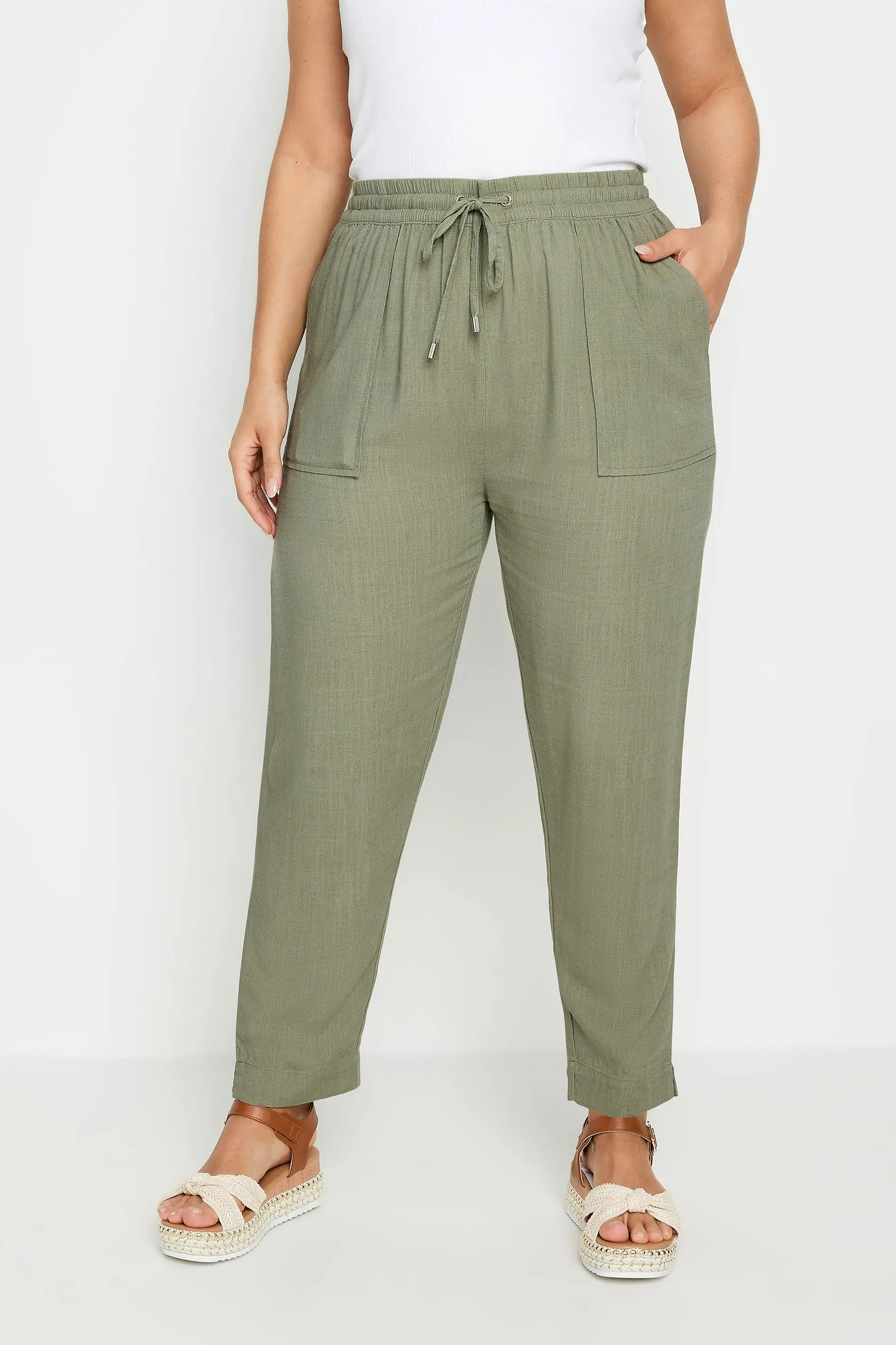 Yours Plus Size Khaki Green Tie Front Linen Joggers Size 26-28