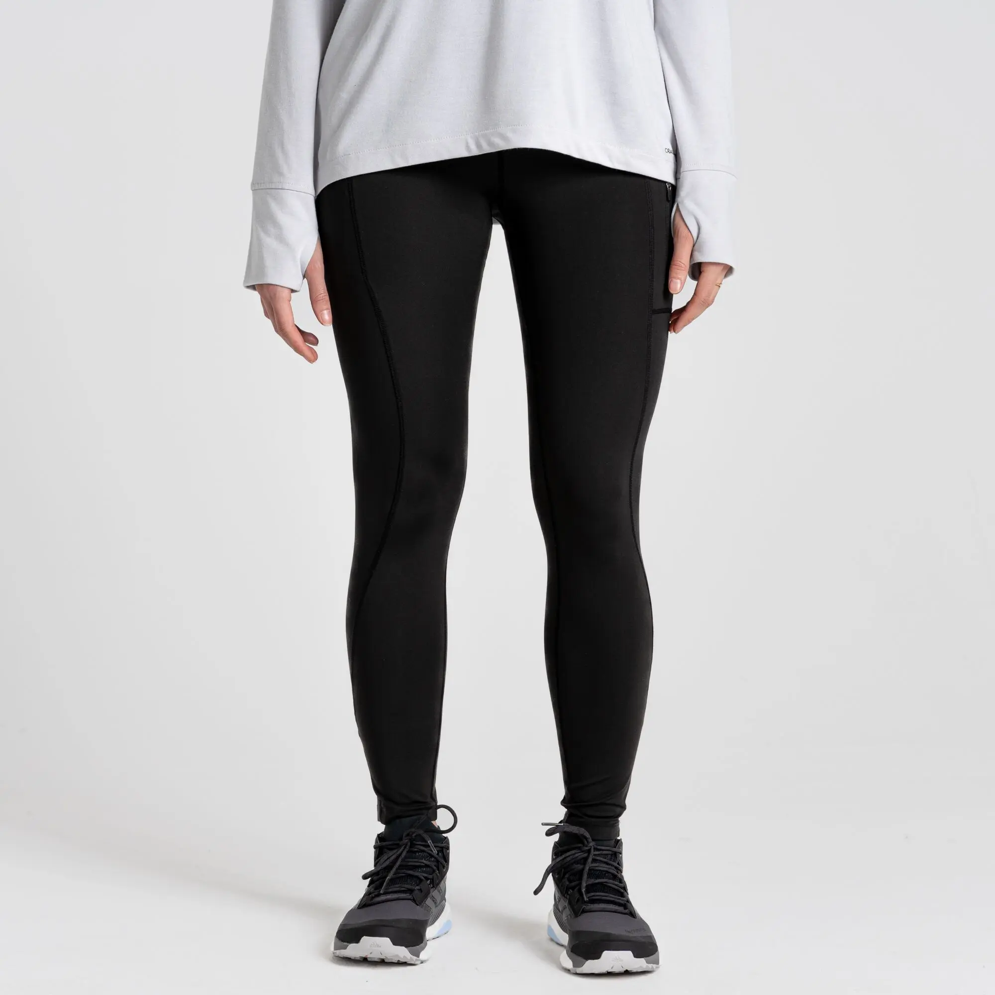 High-waisted, ultra-stretchy compression leggingsfrom Craghoppers offer complete freedom of movement on the trail, all year round. Sun-protective construction with 2 pockets including zipped security pocket and featuring a showerproof EcoShield DWR finish.Zipped security pocket2 pockets265g