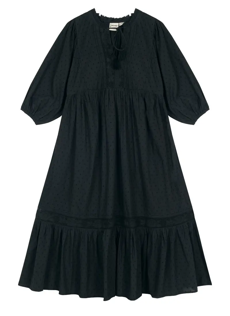 Mamma mia! The Meryl Dress is crafted from soft and lightweight black Swiss dot dobby textured cotton and features a stand collar with broderie anglaise finish and an adjustable tie neckline with tassel detail, long balloon sleeves with elasticated cuffs, a wide, oversized dual-sized fit, and lace inserts at the bottom of the midi-length skirt. Abigail is 5'11 and is wearing a UK size SmallRegular fit - take your usual sizeUK Size S dress length: 124.5cmSoft and lightweight cottonSwiss dot dobby textureTie neckline with tassel detailCrochet insertsElasticated balloon sleevesFor specific measurements of this garment, please see the Size Guide.
