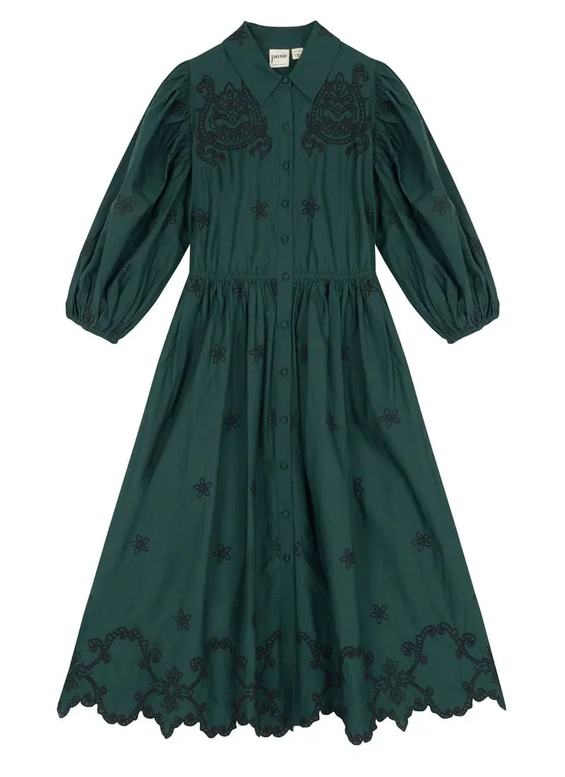 Rachida is here to add a touch of country and western to your occasionwear wardrobe. Crafted from super-soft cotton, this western-style dress features a classic collar and button-through bodice with an elasticated waistband for added comfort, gathered sleeves, and a shaped hem with black embroidery detail. Abigail is 5'11 and is wearing a UK size 10Sha is 5'9.5 and is wearing a UK size 16Regular fit - take your usual sizeUK Size 10 dress length: 121cmWestern-inspired designClassic collarButton-through bodiceElasticated waistbandShaped hem with embroidery detailFor specific measurements of this garment, please see the Size Guide.