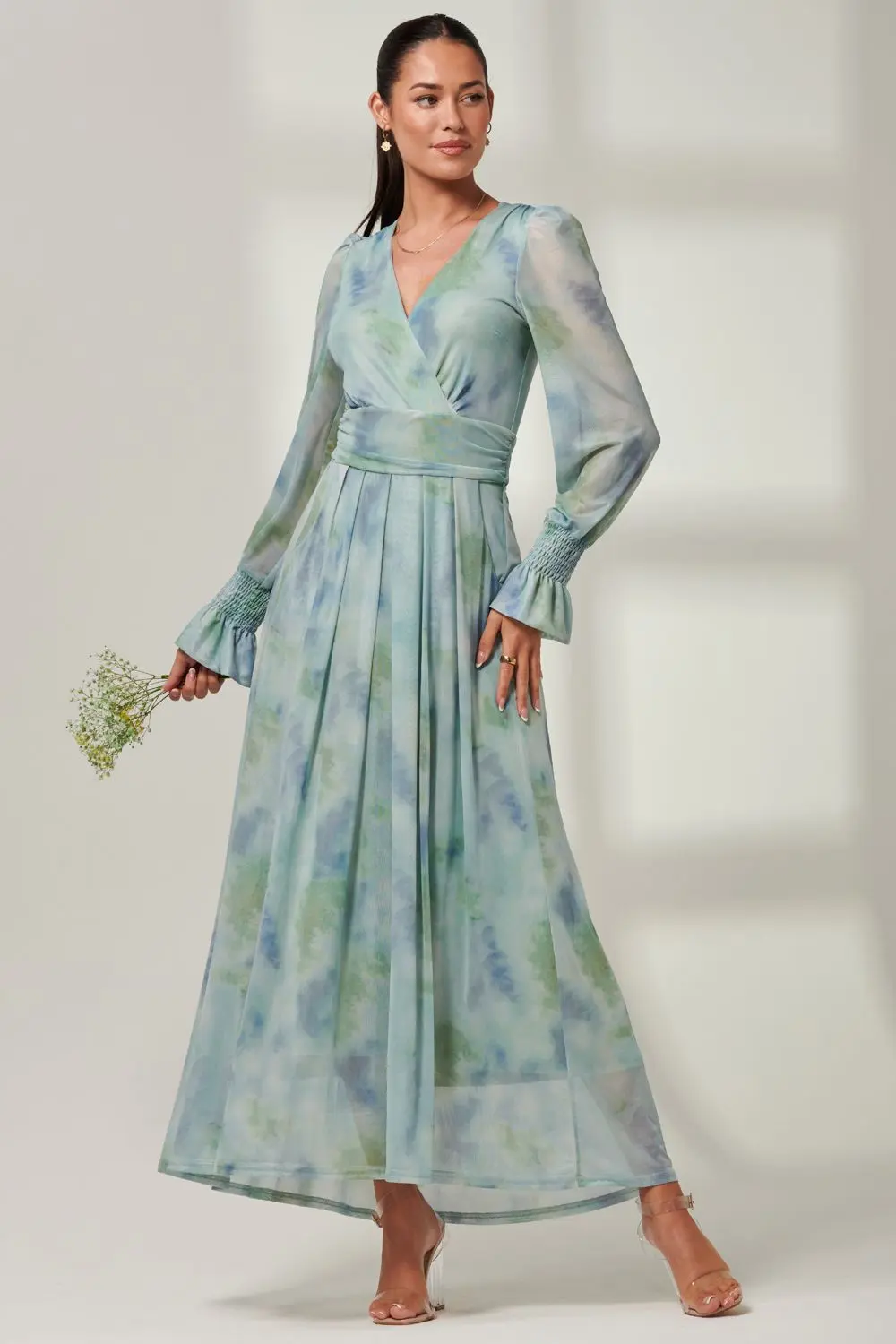 Crafted from light-weight mesh fabric. This maxi dress from Jolie Moi is fashioned with an all over tie dye pattern print. Complimented by a wrapped v-neckline, long puff sleeves with ruched detailing, and an elasticated ruched waistline for form-fitting silhouette. Featuring two side pockets and full lining.