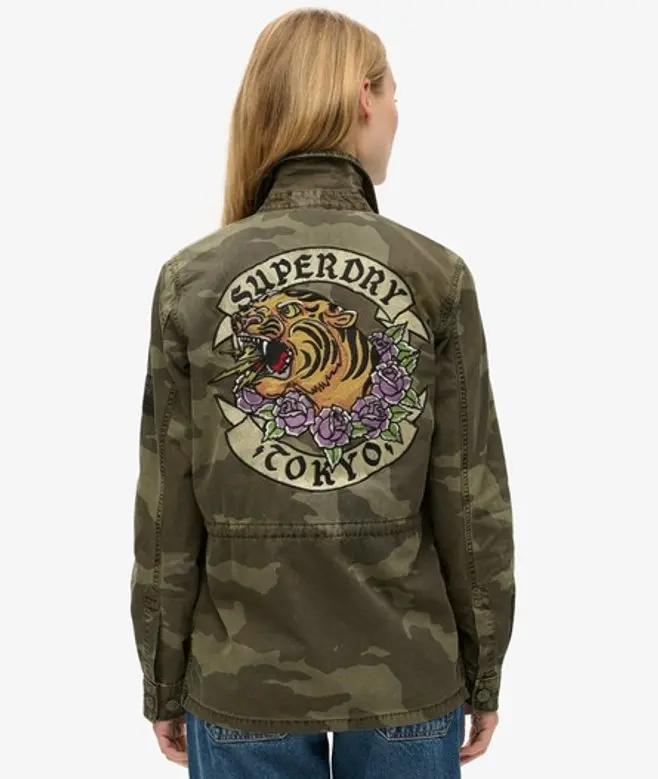 Relaxed fit - the classic Superdry fit. Not too slim, not too loose, just right. Go for your normal size Woven cotton military jacket with embroidery on the back Four external pockets along with button fastening and an adjustable waist UK10 shoulder to hem length: 70cm Designed with the fashionable in mind, we've crafted this military jacket for you. With practical features such as four external pockets. With adjustable button cuffs and an adjustable waistline, it's got everything you need to achieve that perfectly tailored look, along with a large embroidered image, you can stay true to your much-loved style whilst elevating it.
