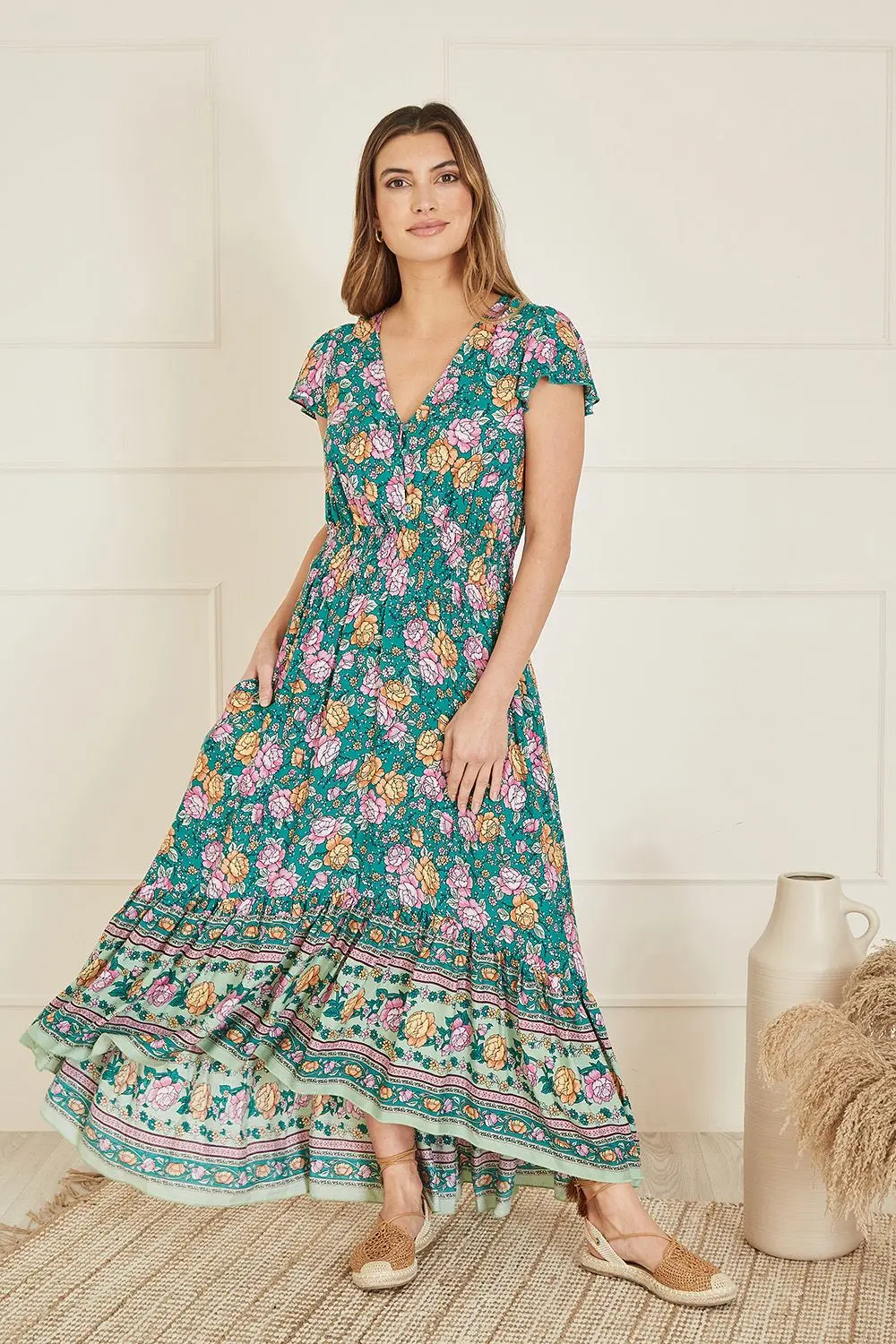 Yumi Women's Green Festival Floral Print Ruched Waist Maxi Dress
