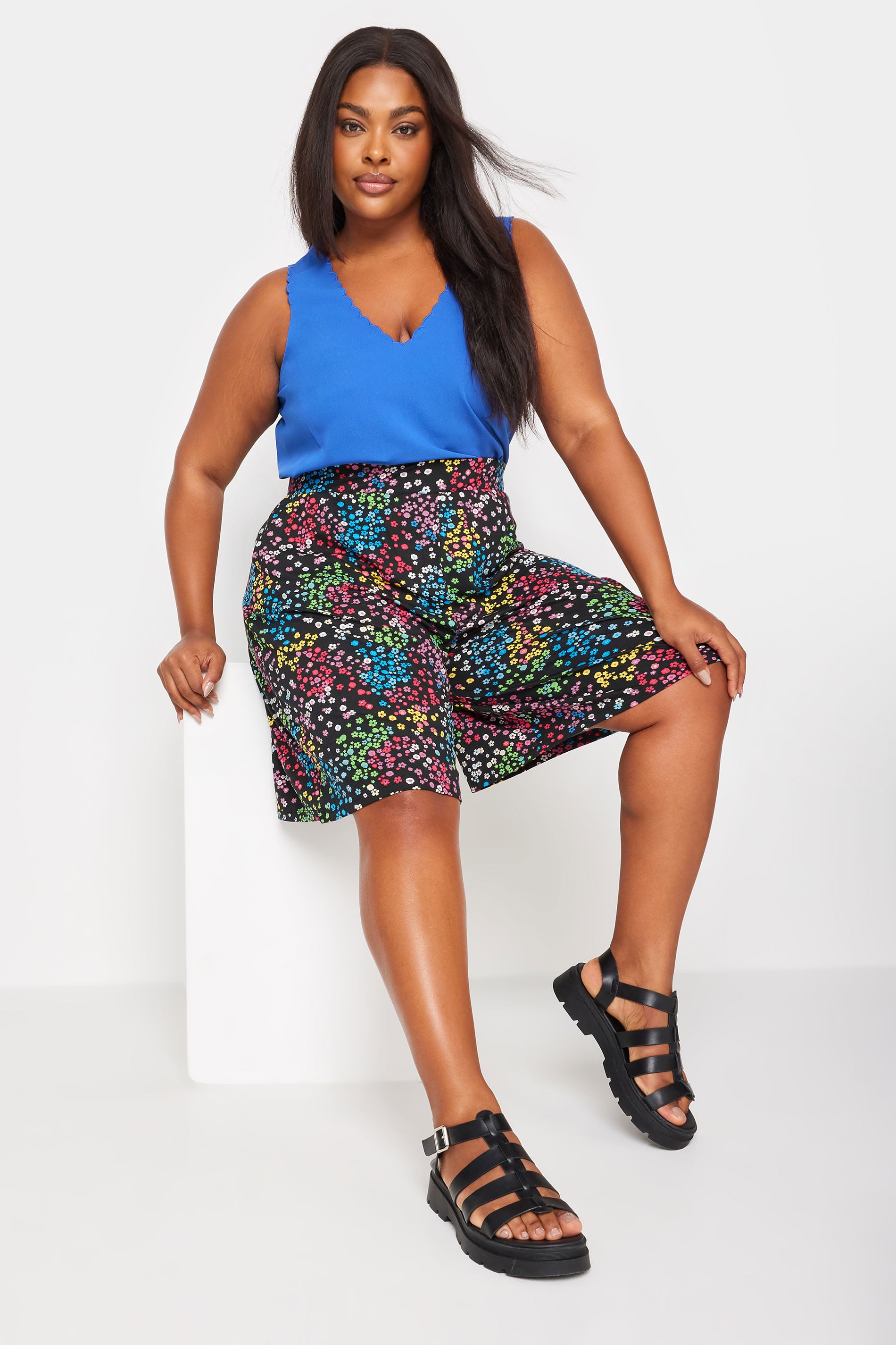 Yours Plus Size Black Rainbow Ditsy Floral Print Jersey Shorts Size 20