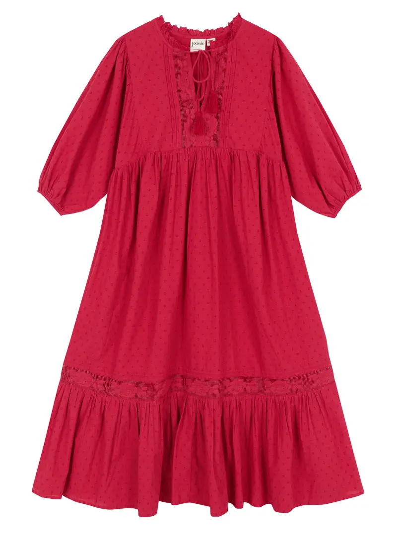 Mamma mia! The Meryl Dress is crafted from soft and lightweight red Swiss dot dobby textured cotton and features a stand collar with broderie anglaise finish and an adjustable tie neckline with tassel detail, long balloon sleeves with elasticated cuffs, a wide, oversized dual-sized fit, and lace inserts at the bottom of the midi-length skirt. Abigail is 5'11 and is wearing a UK size 10Regular fit - take your usual sizeUK Size S dress length: 124.5cmSoft and lightweight cottonSwiss dot dobby textureTie neckline with tassel detailCrochet insertsElasticated balloon sleevesFor specific measurements of this garment, please see the Size Guide.