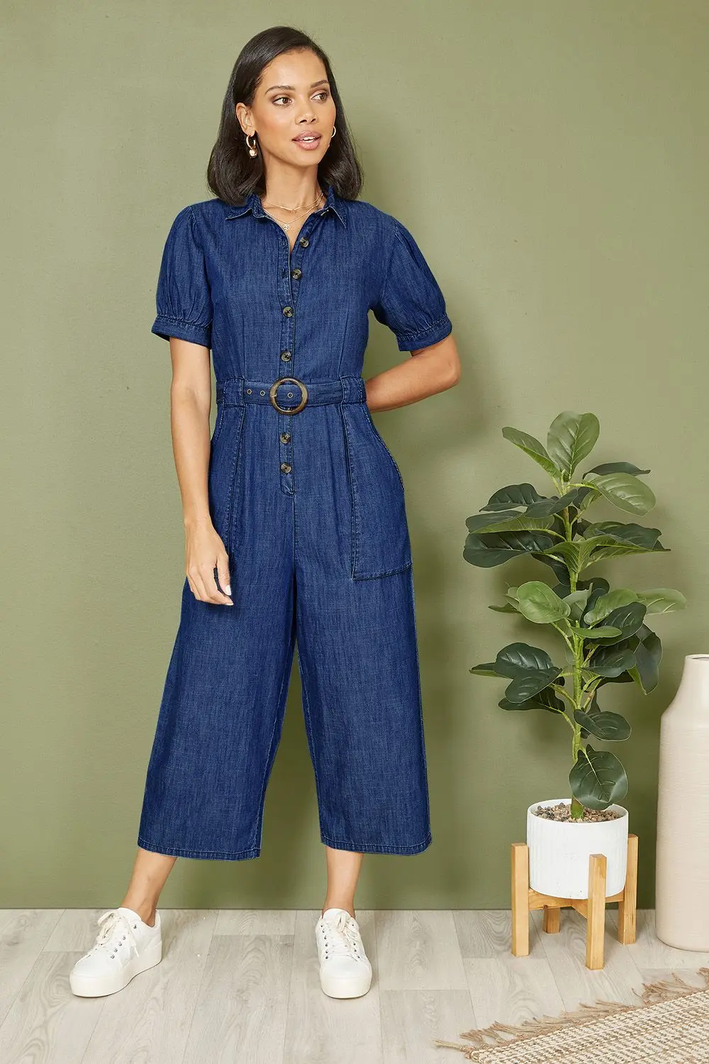 Yumi Women's Blue Cotton Chambray Button Up Jumpsuit