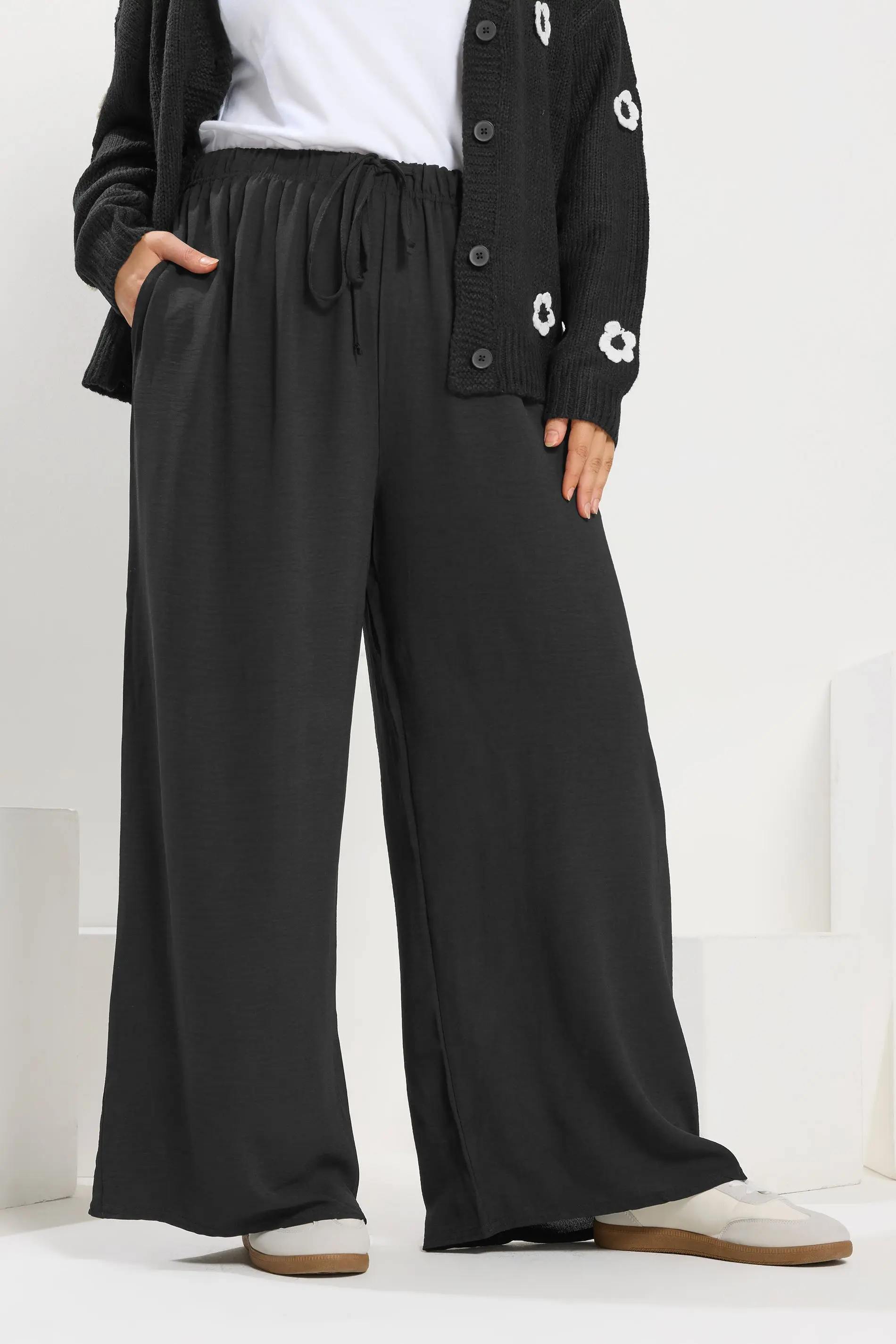 These wide leg twill trousers are a must-have for your everyday wardrobe! Made from a comfortable woven fabric, they feature two side pockets, an elasticated waistband and an adjustable drawstring tie fastening. Style with a vest top and sandals for a summer ready look you'll love.